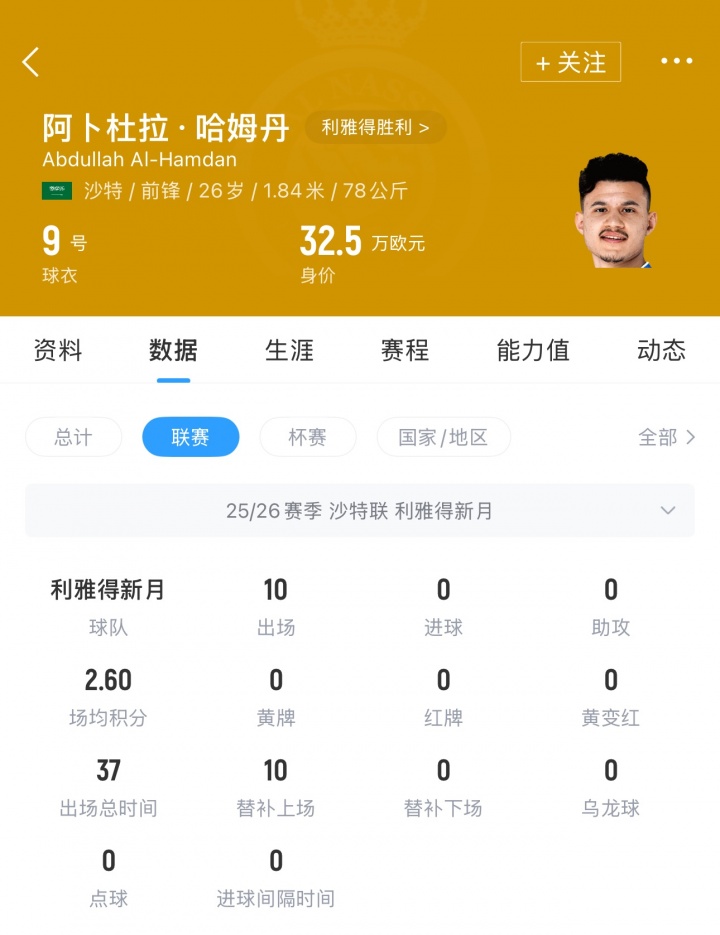 哈姆丹现年26岁,司职中锋,德转身价32.5万欧,为利雅得新月效力5年,出场145次取得13球10助攻。本赛季,哈姆丹在新月15场431分钟仅1球,其中沙特联10场37分钟0球0助攻。他还是沙特国脚,代表沙特出场44次贡献10球2助攻。