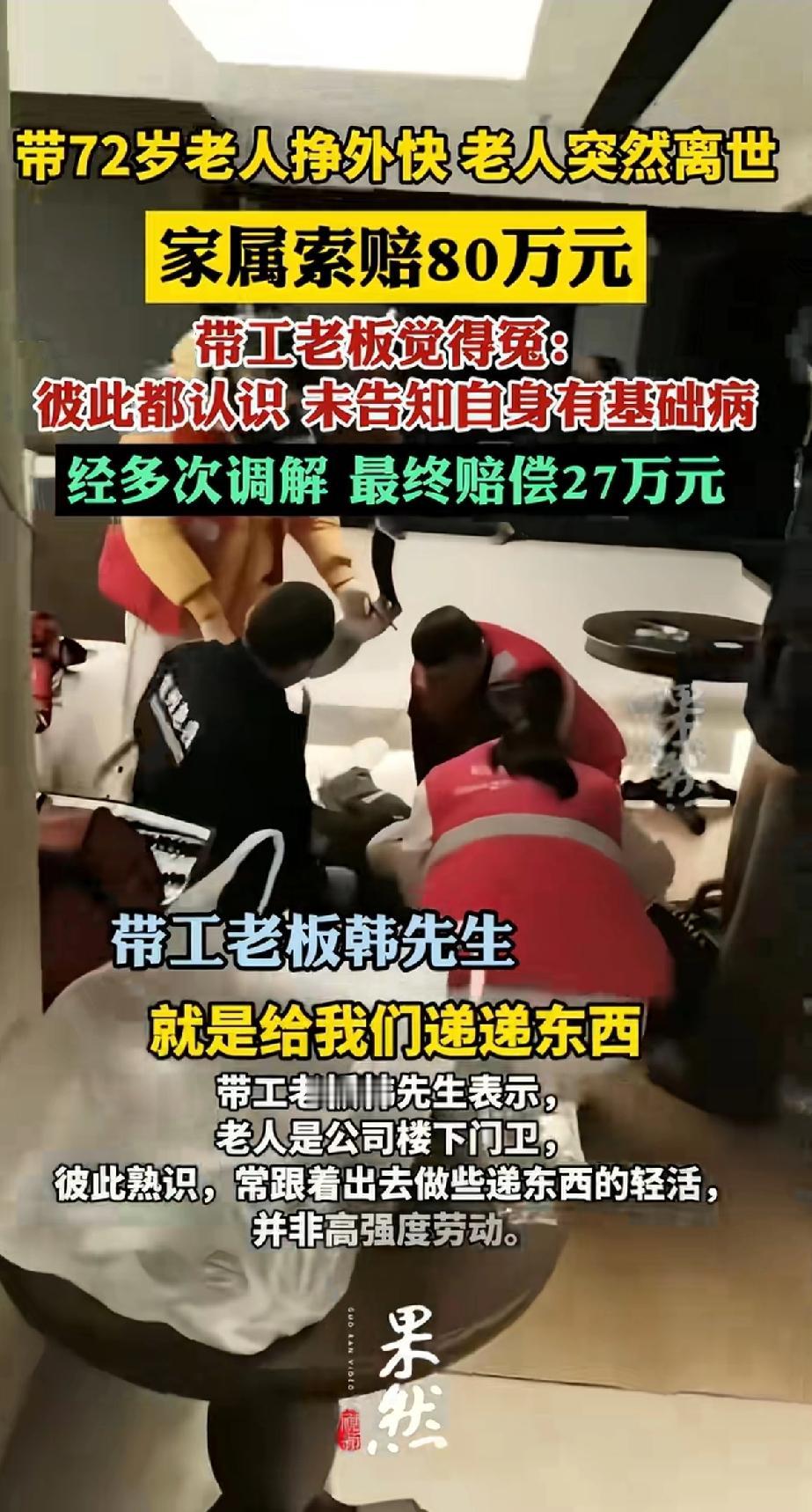 带72岁老人挣外快,老人突然离世。浙江杭州这事儿真让人唏嘘。72岁门卫大爷跟着老板韩先生外出挣外快,结果突然离世,家属索赔80万。 韩老板也挺无奈,老人是公司楼下门卫,平时就跟着做递东西这类轻活,又不是高强度劳动。而且老人也没说自己有基础病,可能干活时长诱发了心脏病。 事发后韩老板还尽全力施救了。最后经过多次协商调解,赔了27万。这事儿两边都有难处,老人离世家属伤心,老板也没想到会出这种意外。 看到这个新闻一阵后怕,前年我那个公寓里面有很多纸箱,本来想送给本栋楼的保洁,下楼时碰到一个驼背的老人翻垃圾箱捡废品。 看到这一幕,我心想垃圾桶能有啥!跟我走吧,我屋里的纸箱都给你,比你一天捡的纸箱都多。一时心软让老人上楼拿纸箱。 我从房子里把纸箱拿出来,老人在楼道里拆纸箱叠纸箱,我当时看他颤颤巍巍心里就后悔了,又不忍心让他空手走,就这样帮忙让他把所有纸箱拿走了。 现在看到这个新闻真是一阵后怕,万一当时老人出点意外我真是跳进黄河也洗不清了。 看来以后做什么事要带着脑子。不能按自己想的来。 只能说世事无常,大家工作时还是得多注意身体状况。