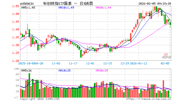 2月5日,科创综指ETF国泰(589630)开盘跌0.35%,报1.443元。科创综指ETF国泰(589630)重仓股方面,寒武纪开盘跌1.68%,海光信息跌2.11%,中芯国际跌1.61%,中微公司跌2.64%,金山办公跌1.32%,澜起科技跌5.28%,百利天恒涨0.75%,联影医疗涨0.04%,影石创新跌0.74%,盛美上海跌2.18%。