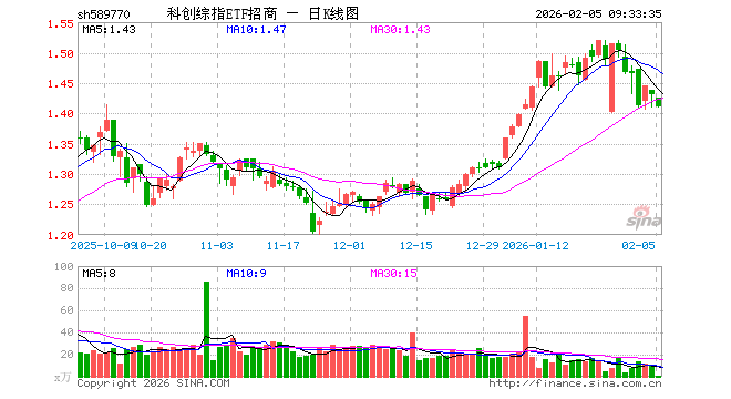 2月5日,科创综指ETF招商(589770)开盘跌0.35%,报1.426元。科创综指ETF招商(589770)重仓股方面,寒武纪开盘跌1.68%,海光信息跌2.11%,中芯国际跌1.61%,中微公司跌2.64%,金山办公跌1.32%,澜起科技跌5.28%,百利天恒涨0.75%,联影医疗涨0.04%,影石创新跌0.74%,拓荆科技跌3.47%。