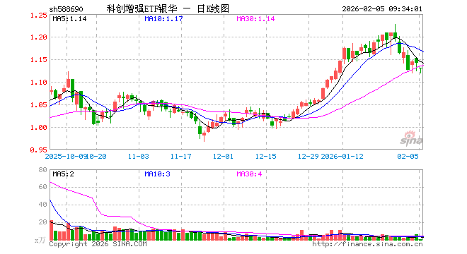2月5日,科创增强ETF银华(588690)开盘跌0.96%,报1.130元。科创增强ETF银华(588690)重仓股方面,寒武纪开盘跌1.68%,海光信息跌2.11%,中芯国际跌1.61%,中微公司跌2.64%,澜起科技跌5.28%,金山办公跌1.32%,百利天恒涨0.75%,艾力斯涨0.00%,厦钨新能跌1.02%,睿创微纳跌1.71%。