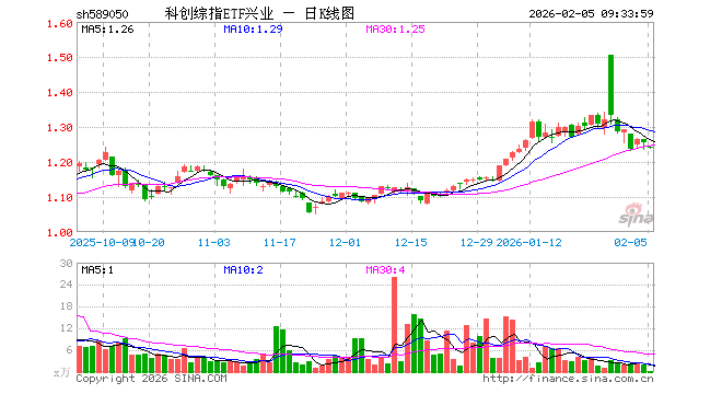 2月5日,科创综指ETF兴业(589050)开盘跌0.96%,报1.243元。科创综指ETF兴业(589050)重仓股方面,寒武纪开盘跌1.68%,海光信息跌2.11%,中芯国际跌1.61%,澜起科技跌5.28%,百利天恒涨0.75%,金山办公跌1.32%,拓荆科技跌3.47%,中微公司跌2.64%,联影医疗涨0.04%,影石创新跌0.74%。