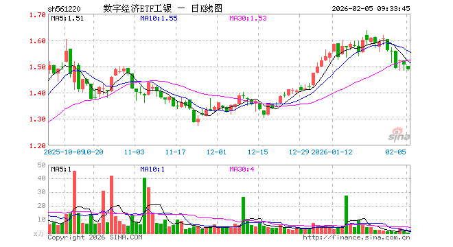 2月5日,数字经济ETF工银(561220)开盘跌0.40%,报1.500元。数字经济ETF工银(561220)重仓股方面,中芯国际开盘跌1.61%,海光信息跌2.11%,北方华创跌1.61%,中微公司跌2.64%,中科曙光跌1.21%,生益科技跌1.18%,海康威视跌1.03%,浪潮信息跌1.17%,中国电信跌0.17%,深南电路跌1.98%。