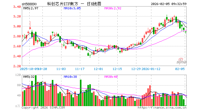2月5日,科创芯片ETF南方(588890)开盘跌1.13%,报2.892元。科创芯片ETF南方(588890)重仓股方面,中芯国际开盘跌1.61%,海光信息跌2.11%,寒武纪跌1.68%,澜起科技跌5.28%,中微公司跌2.64%,拓荆科技跌3.47%,芯原股份跌4.04%,华虹公司跌2.18%,沪硅产业跌1.28%,东芯股份跌1.99%。