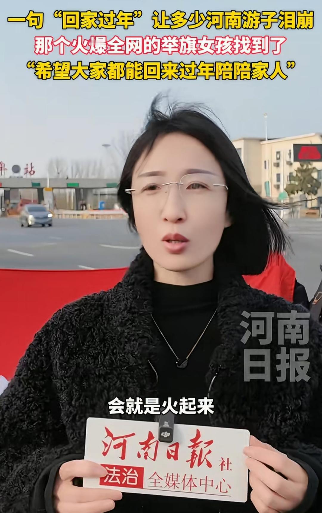 全网疯找的河南举旗女孩找到了!寒风中的一抹红,暖哭上亿归乡人 郑州高速口那面迎风飘扬的“回家过年”红旗,终于找到了主人!这个在寒风中微笑着向归乡车流挥手的姑娘,仅凭一个简单举动,两天刷爆全网,相关话题阅读量破亿,让无数漂泊者瞬间破防。 2月1日立春前夕,郑州连霍高速口,黑衣白裙配红围巾的她,静静站在车流旁举旗致意,没有摆拍、没有策划,这一幕被路人随手拍下,却成了2026春运最暖名场面。网友纷纷留言:“看到这面旗,一年的疲惫全散了”“漂泊的心瞬间落地,原来家乡有人在等”,甚至有在外务工者看后红了眼,连夜踏上归乡路。 全网寻人热潮中,2月3日这位郑州本地的28岁王姑娘被找到,她只是一名普通文职,坦言曾在外漂泊过,懂归乡的期待与不易。眼看过年高速口车流不息,便亲手准备了旗帜,趁休息来送祝福:“钱多钱少不重要,家乡有人盼,愿大家一路平安”。她没想到小举动会引发大反响,还表示天气允许会举旗到除夕,送走最后一批游子。 少数质疑摆拍的声音,早已被满屏的善意淹没。如今已有网友自发陪她举旗,商家送来保暖衣物,这份温暖正在延续。河南网信等官方账号纷纷点赞,称这面旗是河南人的热情,更是游子的“定心丸”。 这面红旗下,藏着中国人刻在骨子里的乡愁与团圆。它不问成就、不谈财富,只轻轻告诉每一个打拼的人:你走再远,家永远在等你。这个冬天,最动人的从不是飞雪,而是归乡路上,这份不掺杂质的善意与牵挂。扛标旗女孩