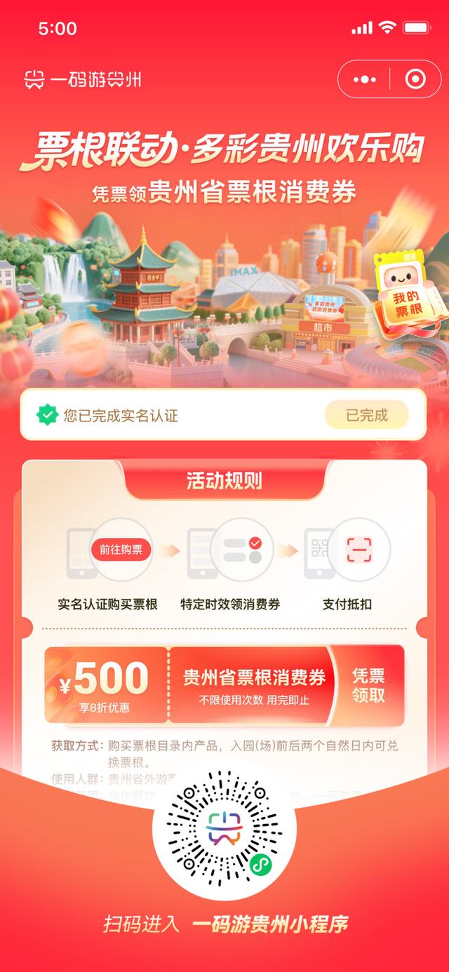 即日起至2026年12月31日,来贵州过年的省外游客,只需凭“一码游贵州”平台购买的指定门票电子票根,即可申领最高500元的消费券,在省内餐饮、购物、加油等多个消费场景享受单笔8折立减优惠。