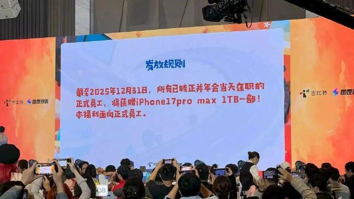 2月3日,有条企业年会相关内容在游戏圈广泛传播——A股游戏企业、有“游戏茅”之称的吉比特(603444 SH)与旗下公司雷霆游戏召开年会。据参会员工在社交平台晒出的照片,公司给所有已转正且当天在职的正式员工,每人配了一台iPhone 17 Pro Max 1TB。此外,现场年会奖品不仅包括常见的手机、现金等,还包括一套价值1000万的房产、20克的定制金币等。
