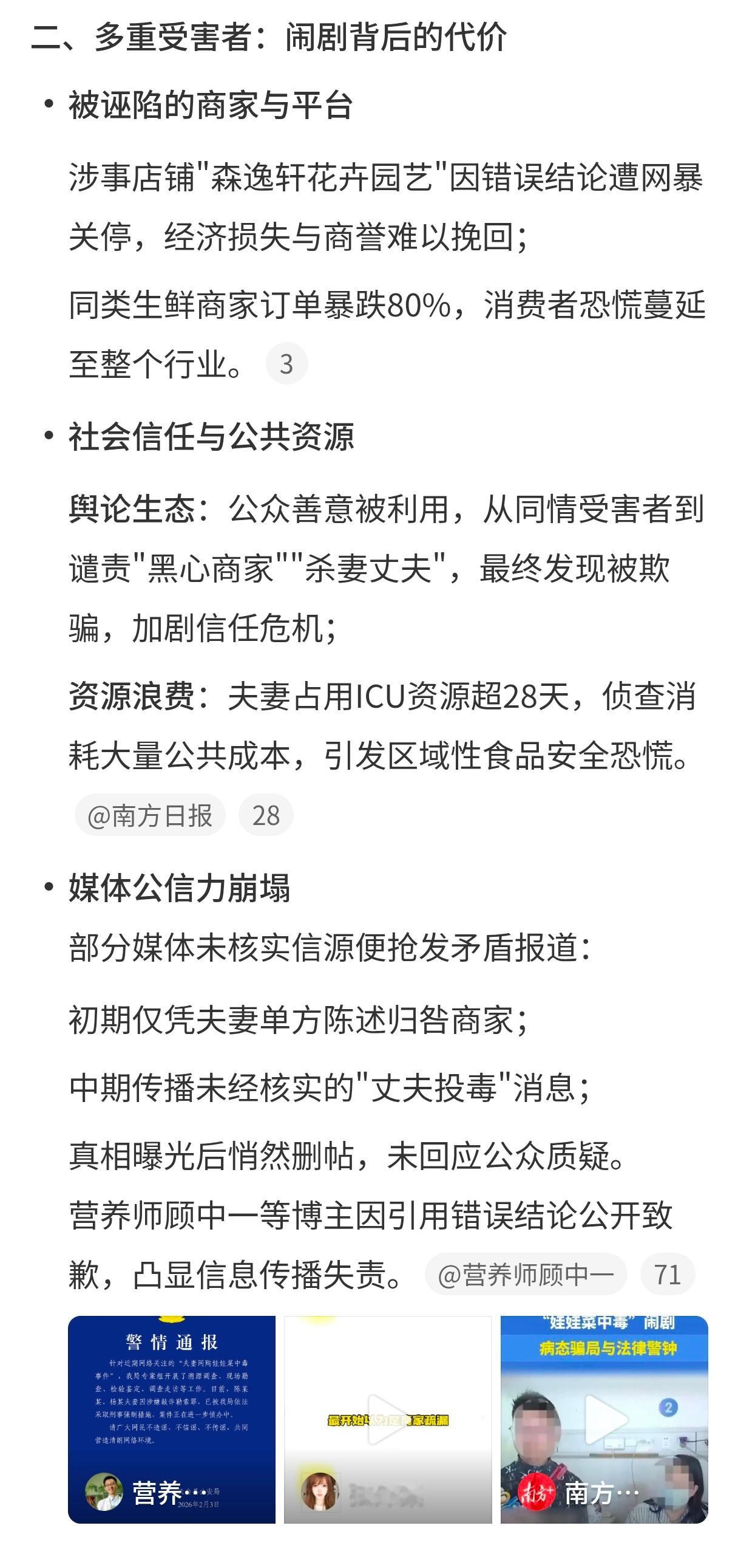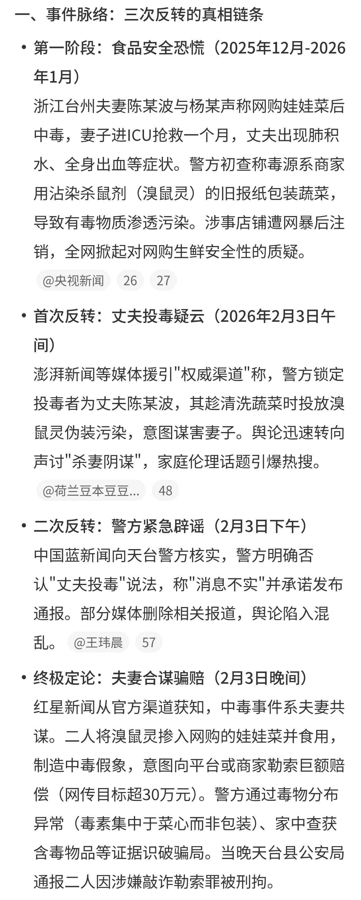 网购娃娃菜中毒反转再反转这件事真的就跟闹一样!关键是一些媒体急着给事件定性,在没跟官方核实的情况下就发布所谓的“权威渠道”报道,从最开始的报纸有毒到丈夫投毒,最后实则是夫妻合谋!商家被网爆关店,妻子敲诈勒索差点把自己的命搭进去,事件本身就离谱,有些媒体还火上浇油,离谱到家了…