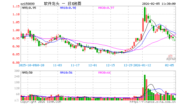 2月5日,截止午间收盘,软件龙头ETF(159899)跌1.68%,报0.935元,成交额2204.21万元。软件龙头ETF(159899)重仓股方面,科大讯飞截止午盘跌1.69%,金山办公跌1.48%,同花顺跌2.37%,指南针跌1.19%,恒生电子跌1.18%,拓维信息跌1.53%,润和软件跌1.51%,三六零跌3.26%,深信服跌2.57%。