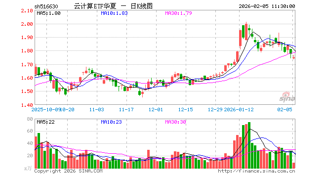 2月5日,截止午间收盘,云计算ETF华夏(516630)跌1.52%,报1.747元,成交额1515.15万元。云计算ETF华夏(516630)重仓股方面,科大讯飞截止午盘跌1.69%,金山办公跌1.48%,中际旭创涨0.89%,新易盛跌3.37%,浪潮信息跌0.92%,中科曙光跌0.82%,紫光股份跌1.53%,恒生电子跌1.18%,润泽科技跌4.50%,拓维信息跌1.53%。