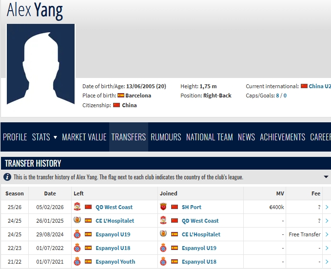 直播吧02月05日讯据德转显示,20岁的右后卫杨希已经从青岛西海岸转会至上海海港。