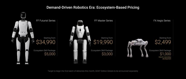 贾跃亭发布的图片显示,Futurist系列机器人起售价34990美元(现汇率约合24.3万元人民币),Master系列机器人起售价19990美元(现汇率约合13.9万元人民币),Aegis系列机器人起售价2499美元(现汇率约合1.73万元人民币)。