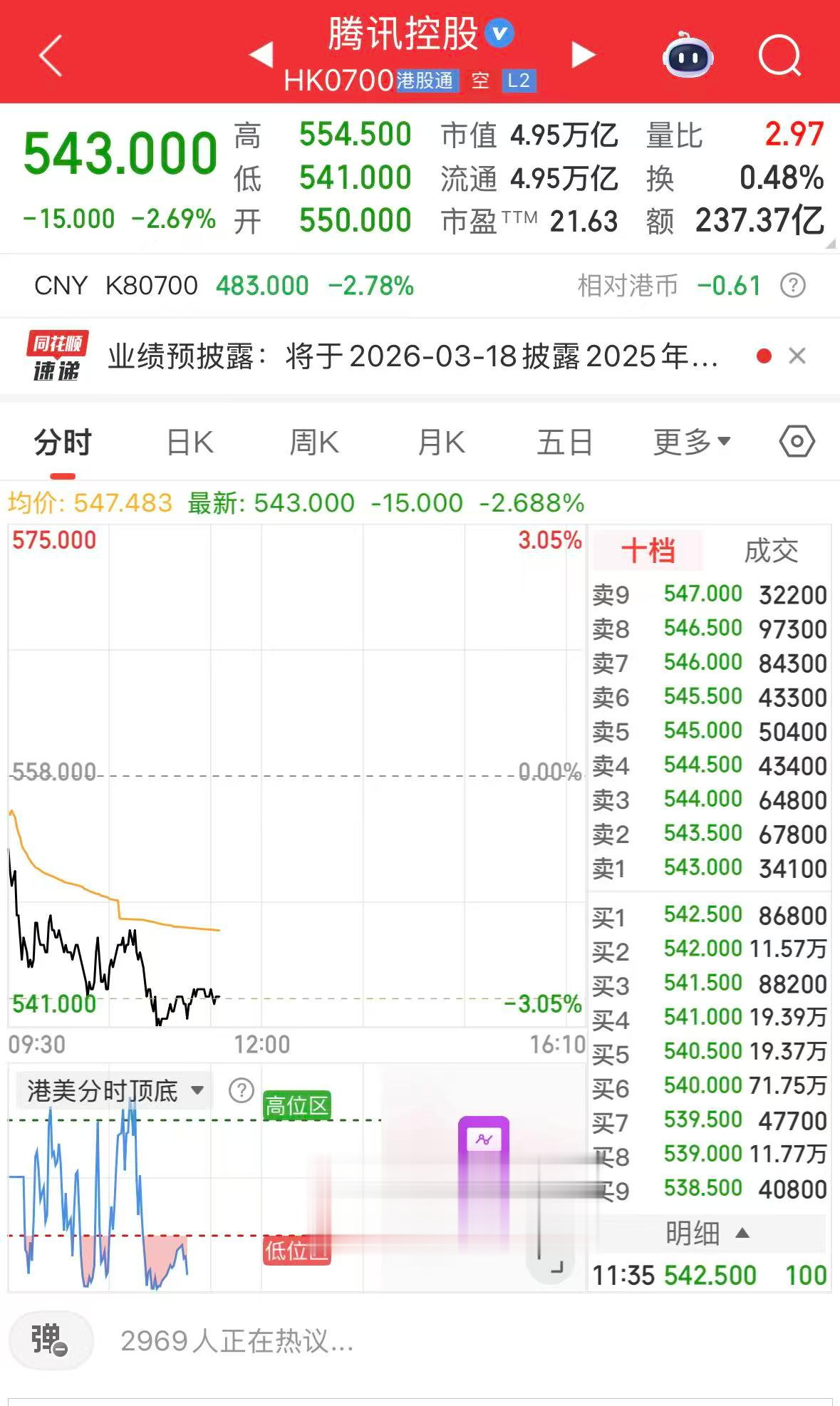 2月5日盘中,腾讯控股(00700.HK)股价跌2.87%,股价542港元/股,市值4.95万亿港元,跌破5万亿港元。截至发稿,腾讯日内跌2.69%,报543港元/股。此前腾讯股价已连续4个交易日下跌。