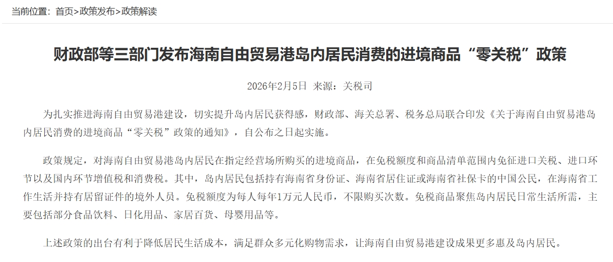 据财政部网站5日公告,财政部等三部门发布海南自由贸易港岛内居民消费的进境商品“零关税”政策。以下为全文: