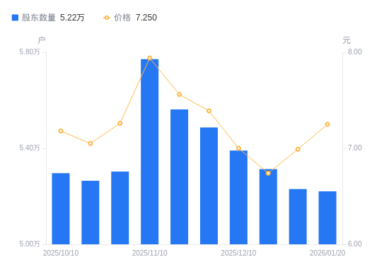 日期A股户数(户)流通A股户均持股数(股)户均持股市值(万元)2026-01-205220518060.1613.092026-01-095230518025.6312.602025-12-205313617743.7211.962025-12-105390517490.5912.242025-11-305487017182.9912.702025-11-205561916951.5912.822025-11-105771616335.6912.972025-10-315303317778.1912.912025-10-205264917907.8512.632025-10-105296517801.0112.78
