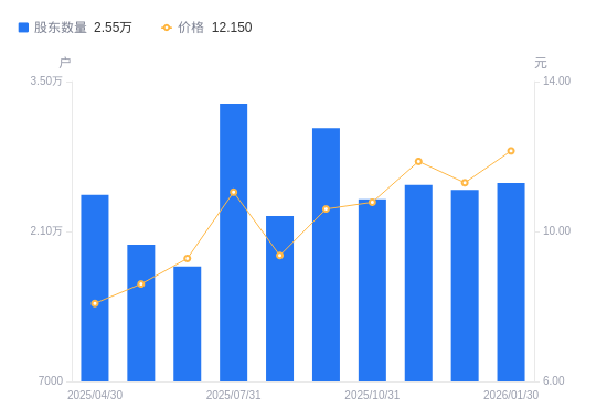 日期A股户数(户)流通A股户均持股数(股)户均持股市值(万元)2026-01-302551813693.8616.642025-12-312487414048.4015.872025-11-282534913785.1616.362025-10-312400914554.5415.692025-09-303065711398.3812.082025-08-292243715574.2714.582025-07-313292910611.9211.732025-06-301772119718.9818.302025-05-301975517688.6915.212025-04-302442814304.9011.56