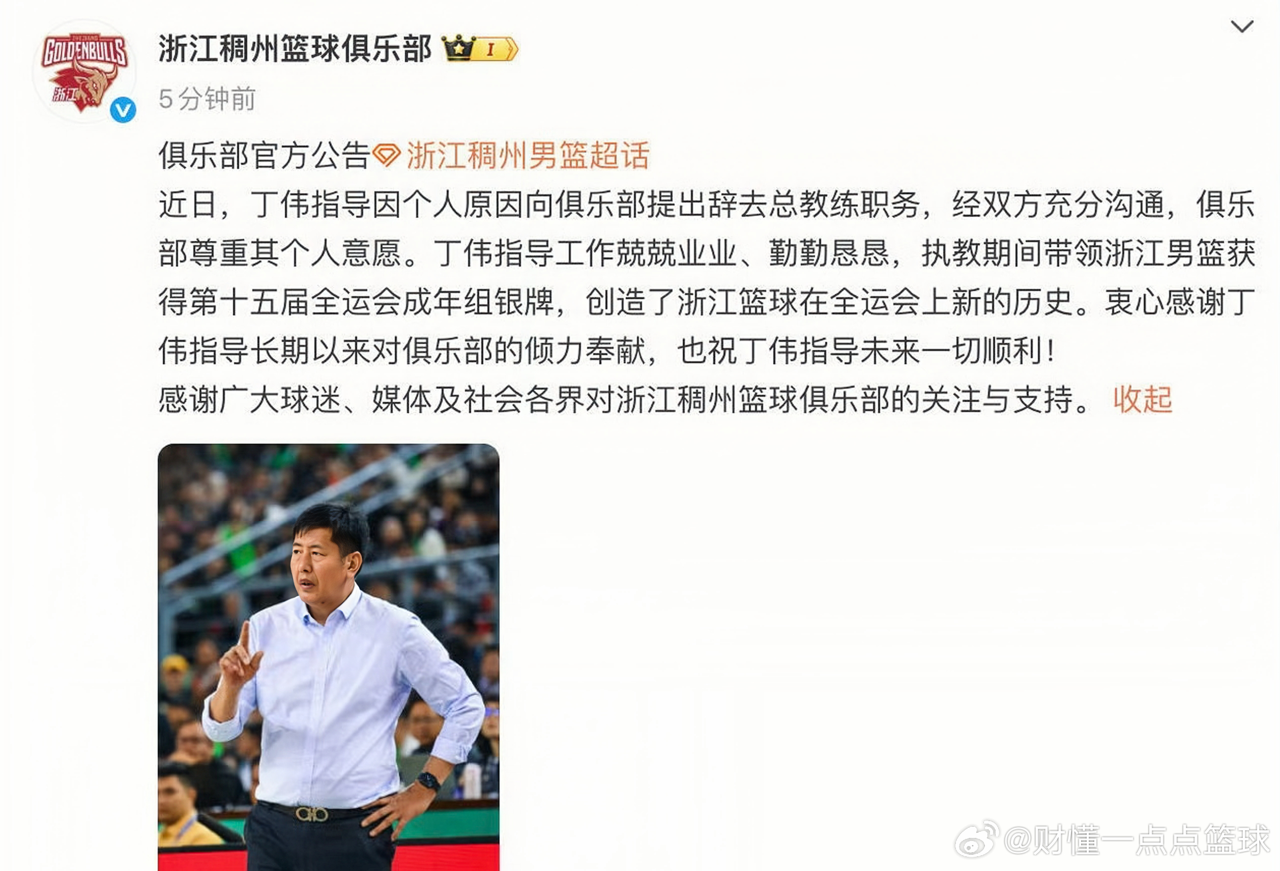 2026年2月5日(今天),浙江稠州男篮刚官宣丁伟因个人原因辞去总教练职务。这是他第三次从浙江队离开,之前12月25日他已从主教练转任总教练(当时带队5轮1胜4负)。三次执教浙江稠州完整战绩1. 第一次(2010-2012赛季,连续两年)2010-11赛季:19胜13负,常规赛第5名,季后赛首轮0-3被江苏横扫出局2011-12赛季:15胜17负,常规赛第11名,无缘季后赛,首次下课2. 第二次(2015-16赛季,中途接手)带队常规赛第8名,成功打进季后赛,后下课3. 第三次(2025年3月-2026年2月,分两阶段)2024-25赛季后半段:接替王世龙任主教练,带队打进季后赛,还率浙江男篮获全运会银牌(队史最佳)2025-26赛季:仅执教5轮,1胜4负(唯一胜场是赢福建,先后输给宁波、广东、山西、上海),12月25日转任总教练,2月5日正式辞职。丁团长这是找到新工作了吗?丁伟辞职
