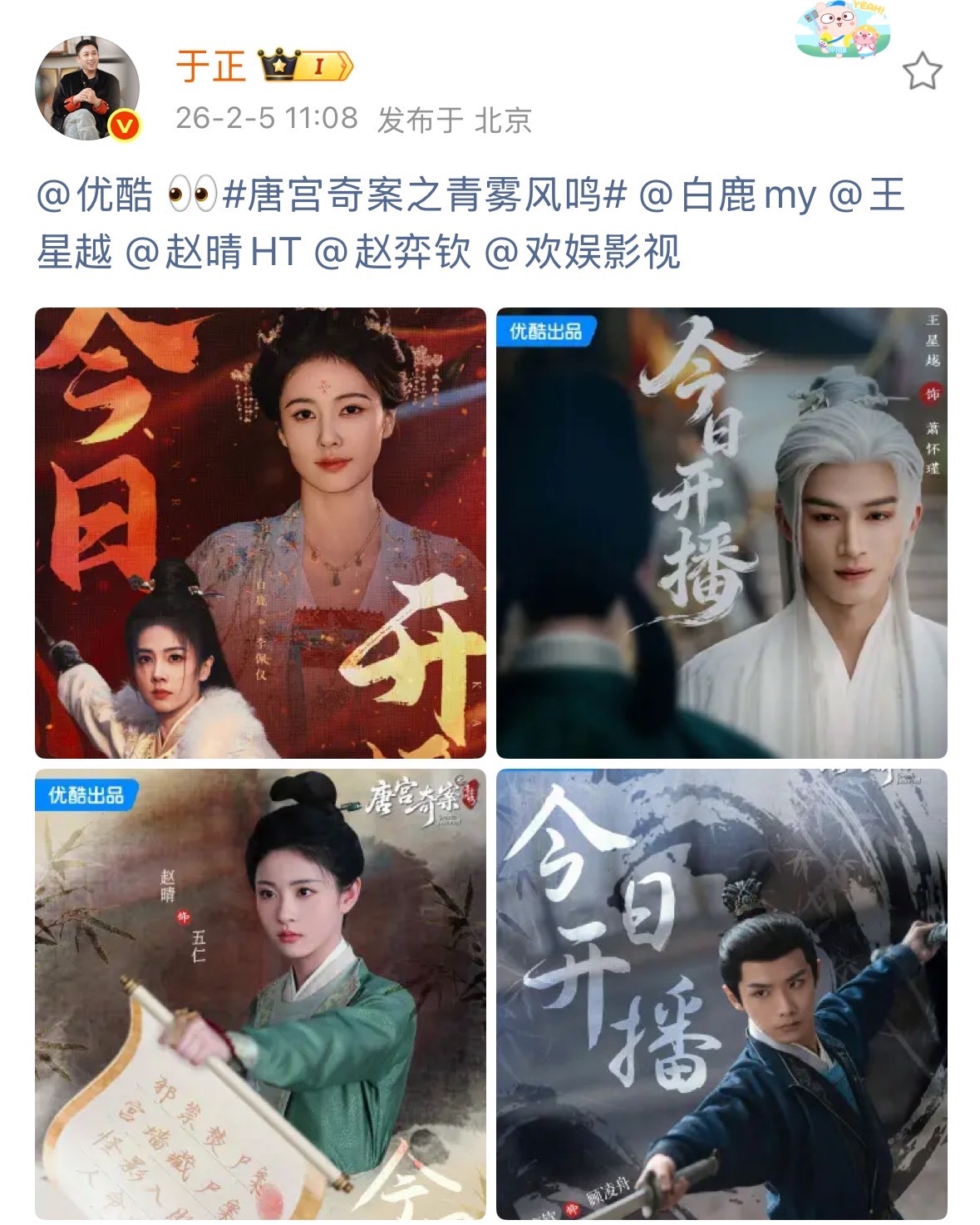 于正宣传唐宫奇案于正宣传白鹿王星越新剧了于正发了唐宫奇案海报唐宫奇案今晚开播