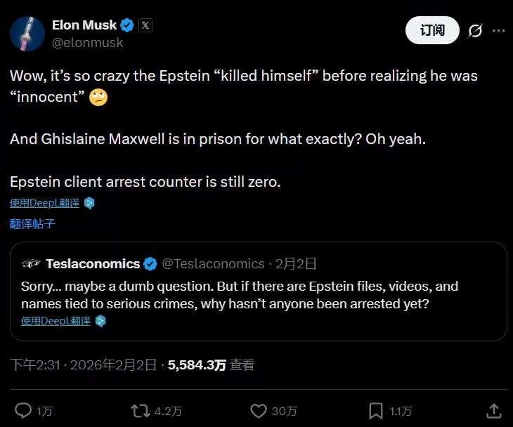 马斯克跟我的想法是一样的:爱泼斯坦虽然被灭口了,但是去过他岛上的客户,无一人被抓