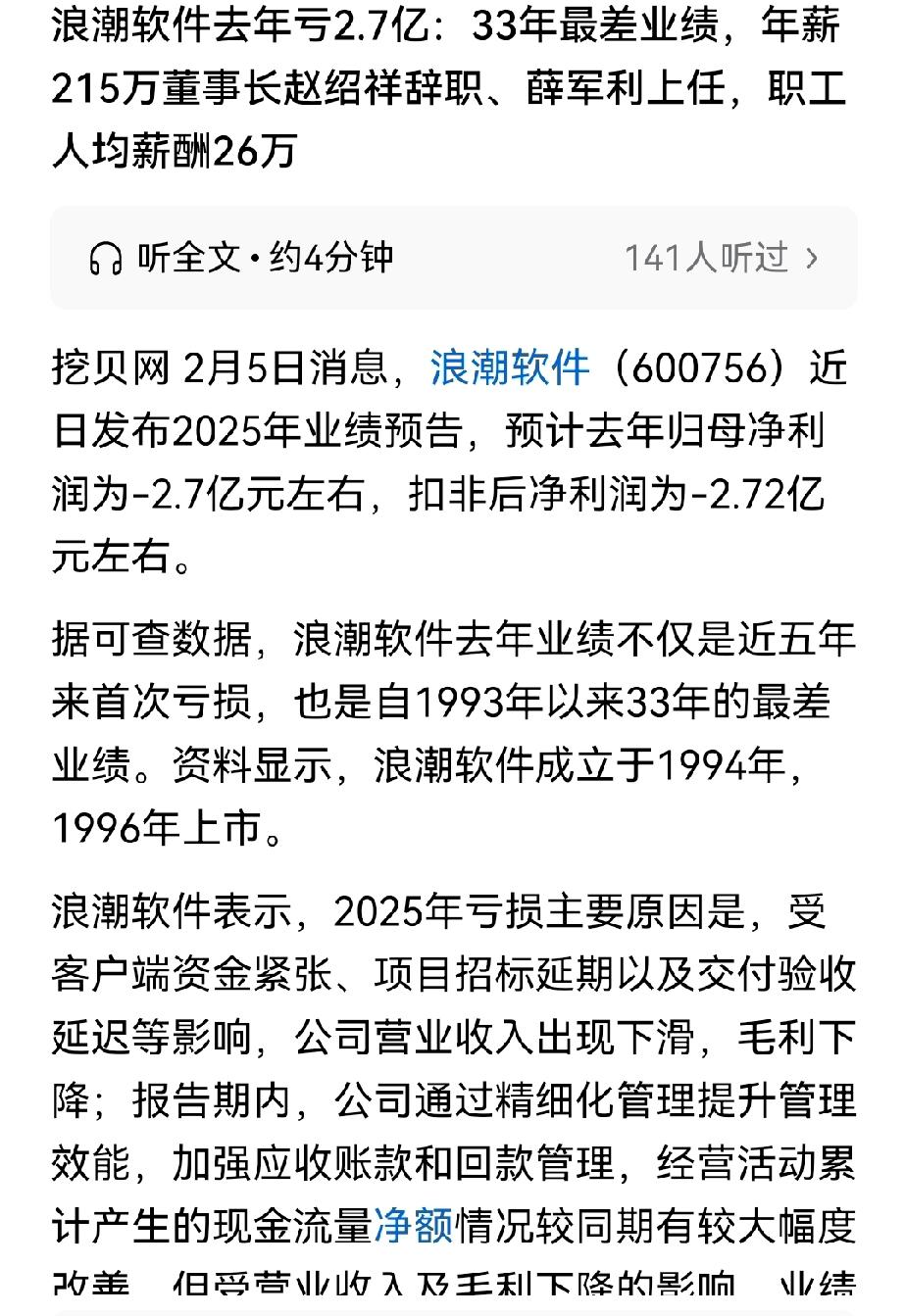 浪潮软件巨亏2.7亿,近五年的利润一下子都亏掉了,职工人均薪酬26万。 其中董事长的年薪就超过了200万。 浪潮软件这是要做对公业务居多,居然还造成亏损。关键是浪潮软件近五年来一年的利润也就几千万,这次亏掉2.7亿元直接把最近几年赚的都亏进去了,还有一些亏损呢。