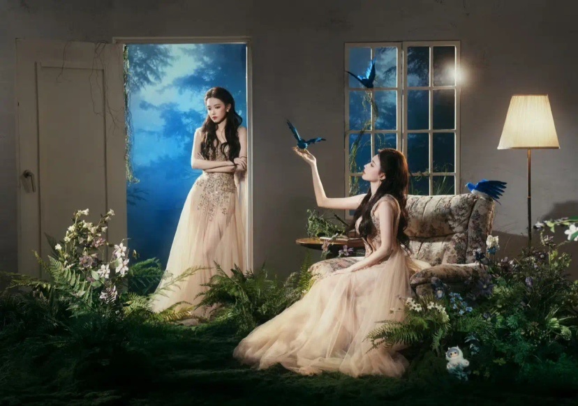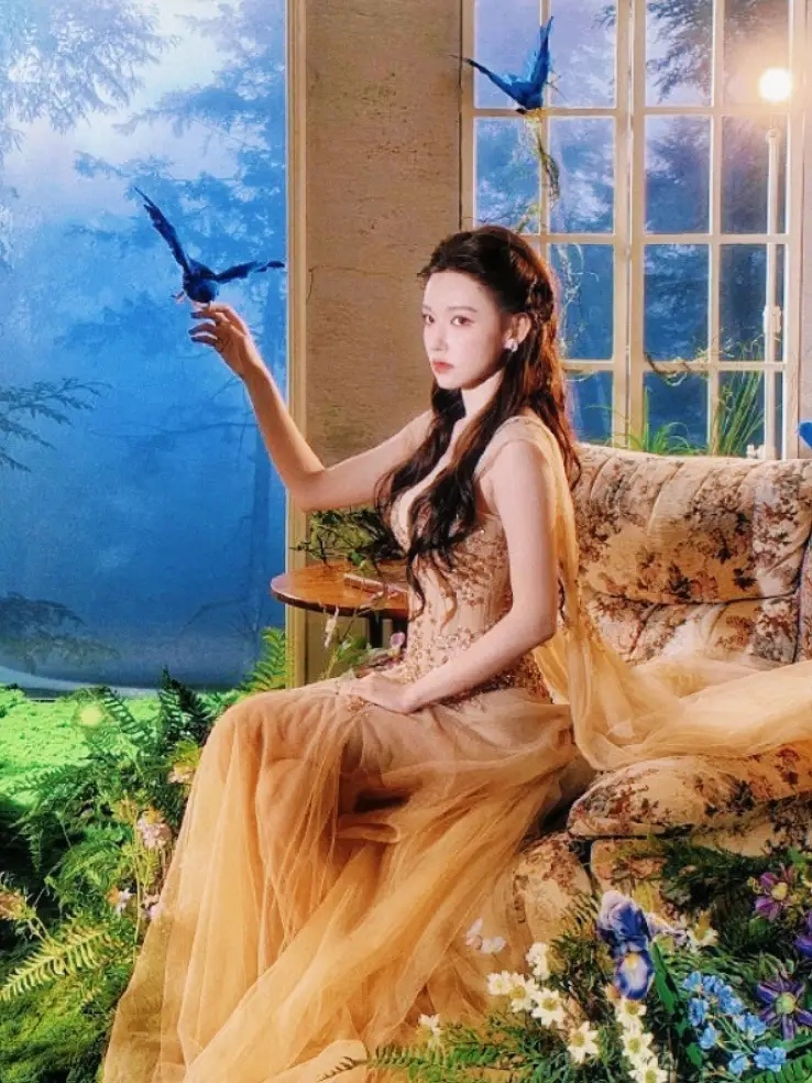 她薄纱材质缀以立体花饰与亮钻,冷白肤色与高饱和礼服形成强烈视觉反差,生图状态被赞"精修级美貌"、"360度无死角",被赞为"花中仙子"、"人间芭比"形容其梦幻氛围!