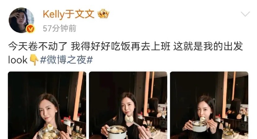 微博之夜红毯于文文,给女孩们提了个醒!2月5日微博之夜,其他女明星饿了一整天,就为了以纤细腰肢示人,于文文这次却一改常态,晒出一张床边吃饭的照片,配文“今天卷不动了,我得好好吃饭再去上班”。