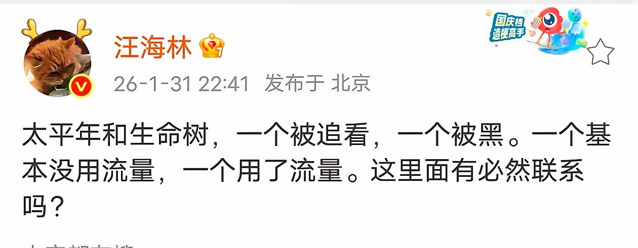 这对比太打脸了!汪海林一句话捅破窗户纸。汪海林把《太平年》和《生命树》两部剧的底裤都给扒了!一个被追看,一个被黑,这差距也太明显了吧!