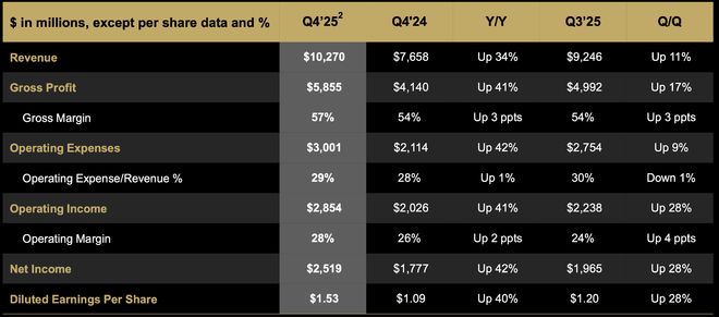 再来看利润,非会计准则下,AMDQ4净利润25.19亿美元,同比大幅增长42%;2025全年,AMD的净利润为68.31亿美元,同比增长26%。