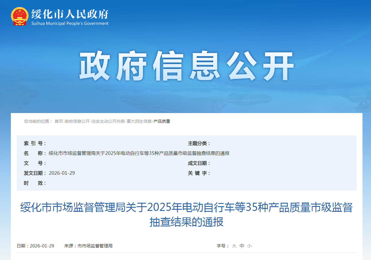 中国质量新闻网讯据黑龙江省绥化市人民政府网站消息,近日,绥化市市场监督管理局通报2025年电动自行车等35种产品质量市级监督抽查结果。