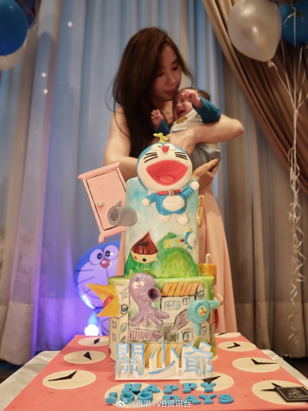 利颖怡保护老公禁曝光利颖怡分享一家三口的合照,见到其夫的样貌依然被遮,“关少爷”的百日派对,以多啦A梦气球及蛋糕做装饰,BB仔更穿上同款打扮,眼睛大大的十分机灵可爱。利颖怡又在家中用另一款蛋糕打卡,为儿子连环庆祝出世100日。