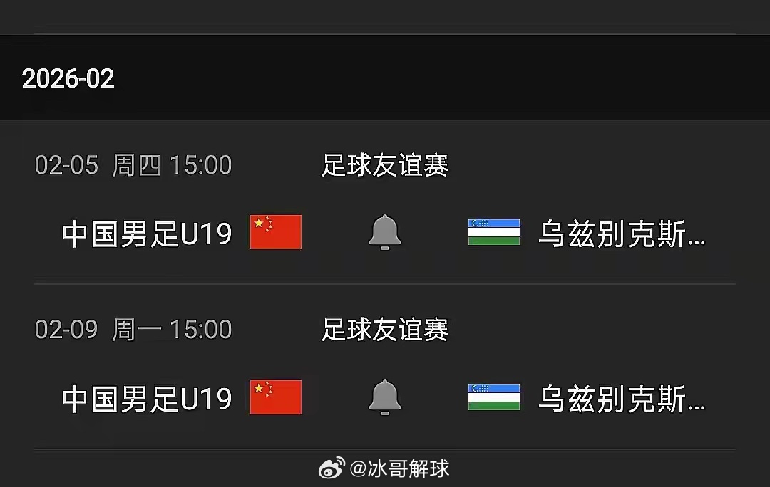 2月5日,中国U19国青将在广东肇庆与乌兹别克斯坦U19展开热身赛,这是2026年双方各级男足的第6次交手。