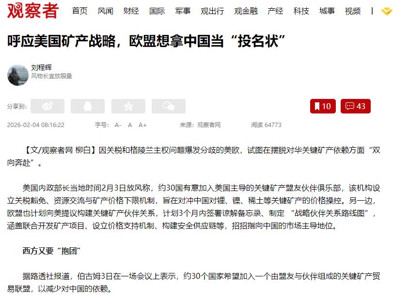 真是可笑!欧洲国家刚访完华,就又要跟美国合伙针对中国!为此,他们想到了一个计划! 可能有人会问,欧洲和美国不是一直闹矛盾吗?怎么突然凑一起了?其实很简单,他们虽然在关税、格陵兰岛主权问题上吵得凶,甚至差点打贸易战,但在针对中国这件事上,想法却完全一致,都不想让中国发展得太好。 他们把目标,放在了我们国家的关键矿产上。所谓关键矿产,就是锂、镍、稀土这些东西,看着不起眼,可用处极大,新能源汽车的电池、高科技装备,都离不开它们,现在各行各业都得靠这些矿产。 而中国在这方面最厉害,不管是开采还是加工,很多国家都得靠中国进口,就算其他国家有矿石,也得送到中国来加工,这就让美欧坐不住了。 他们不想再依赖中国,就想着联手摆脱我们,甚至反过来压制中国,于是就有了各自的计划,还互相配合。 先说说美国,当地时间2月3日,美国内政部长说,已经有大概30个国家,想加入美国牵头的关键矿产俱乐部。 说白了,就是美国拉着一群盟友,搞小圈子,不和中国合作,还说要对冲中国对矿产价格的“操控”。 这话纯属瞎扯,中国从来没操控过矿产价格,价格涨落都是市场说了算。中国一直公平做生意,既满足自己的需求,也给其他国家稳定供货,从来没故意抬价、压价,更没要挟过谁。 美国之所以这么说,就是找借口拉拢盟友,打压中国的优势,其实是他们自己离不开关键矿产进口,技术又落后,没法自己加工,才急着搞这个俱乐部。 再说欧洲这边,一边和美国闹矛盾,一边又主动讨好美国,计划和美国搞关键矿产合作,还说3个月内签协议、定计划。 他们的想法也很明确,和美国一起找矿产、一起开采,稳住矿产价格,打造一个不包含中国的供应链,彻底不用依赖中国,每一步都是针对中国。 其实他们这么做,根本不划算。前阵子欧洲组团访华,就是想和中国合作关键矿产,欧洲很多产业都离不开中国的供应,一旦彻底不依赖中国,他们的成本会大涨,发展也会变慢。 而且美欧的矛盾没解决,美国向来自私,只会考虑自己的利益,欧洲主动妥协,最后肯定会被利用,得不偿失。 更重要的是,他们的计划根本实现不了。关键矿产的开采、加工,需要长期的技术和资金投入,中国做了很多年,技术成熟、产业链完整,美欧短时间内根本赶不上。 而且很多国家都愿意和中国合作,毕竟和中国合作能拿到实实在在的好处,没人愿意为了迎合美欧,牺牲自己的利益。 欧洲刚访完华就变脸,一边想从中国捞好处,一边又想打压中国,这种两面三刀的做法,最后只会害了自己。 中国从来不怕被针对,我们的优势是靠自己努力得来的,不管他们怎么搞小动作,中国都会稳步发展。合作共赢才是正道,他们再折腾,最后只会搬起石头砸自己的脚。
