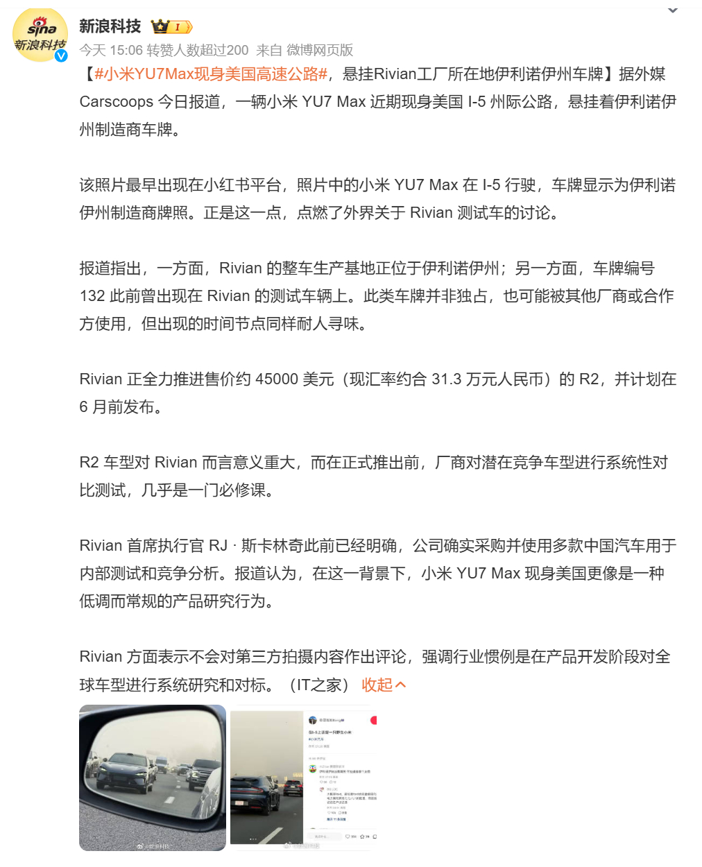 小米YU7Max现身美国高速公路 美国的电动汽车制造商Rivian也研究对标小米YU7 Max了,之前福特汽车和法拉利汽车也买过小米汽车用来研究,说明小米汽车现在不仅在国内被各种对标,在国外也被对标,全球顶尖对手都在拿小米当标杆,过去这份荣誉是属于特斯拉的,中国汽车能做到这个成绩的确很少见。