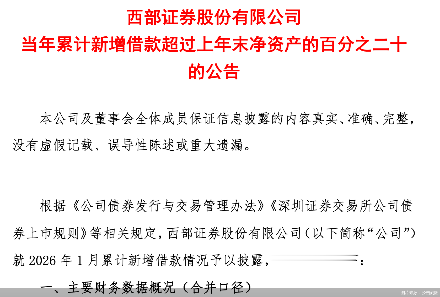 北京商报讯(记者刘宇阳实习生姚榕琰)2月5日,西部证券发布公告称,截至2025年12月31日,西部证券未经审计的净资产为320.08亿元,借款余额为459.36亿元。截至2026年1月31日,其借款余额为540.02亿元,累计新增借款80.66亿元,占上年末净资产比例为25.2%,超20%。