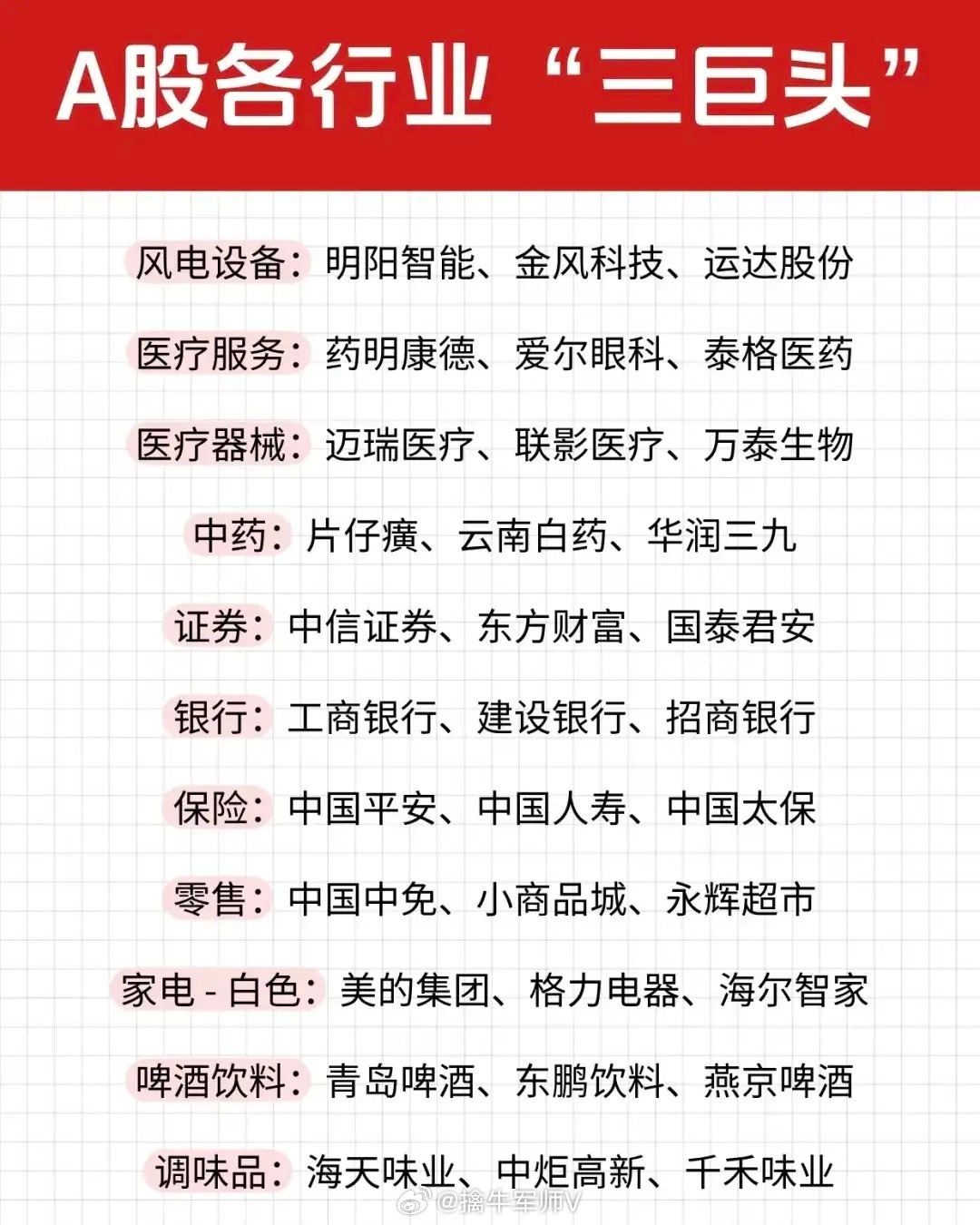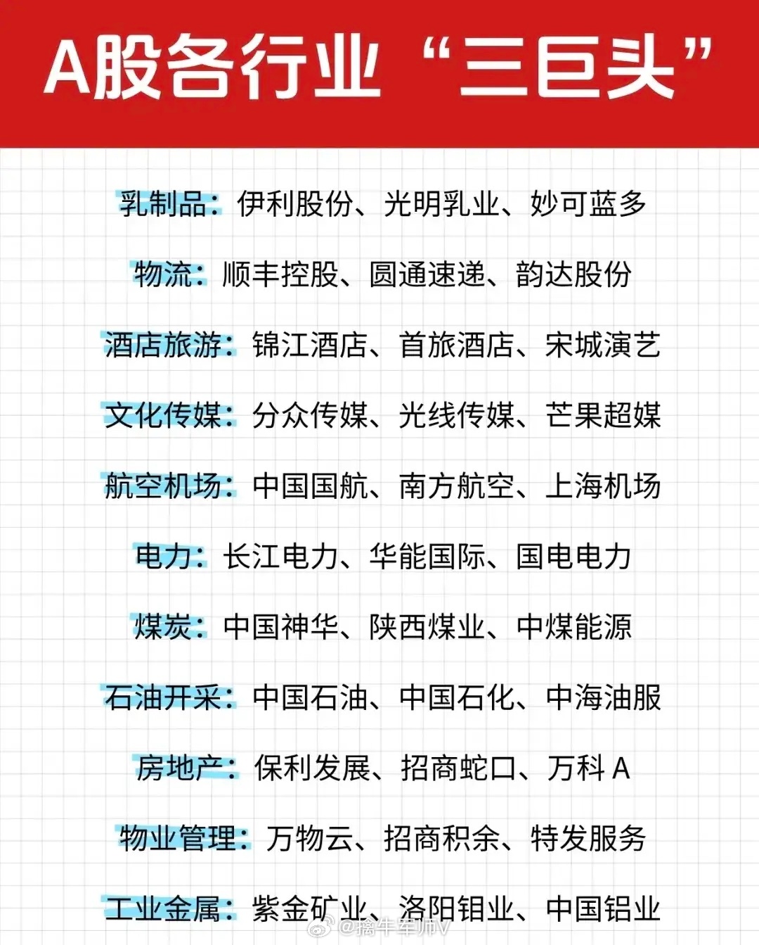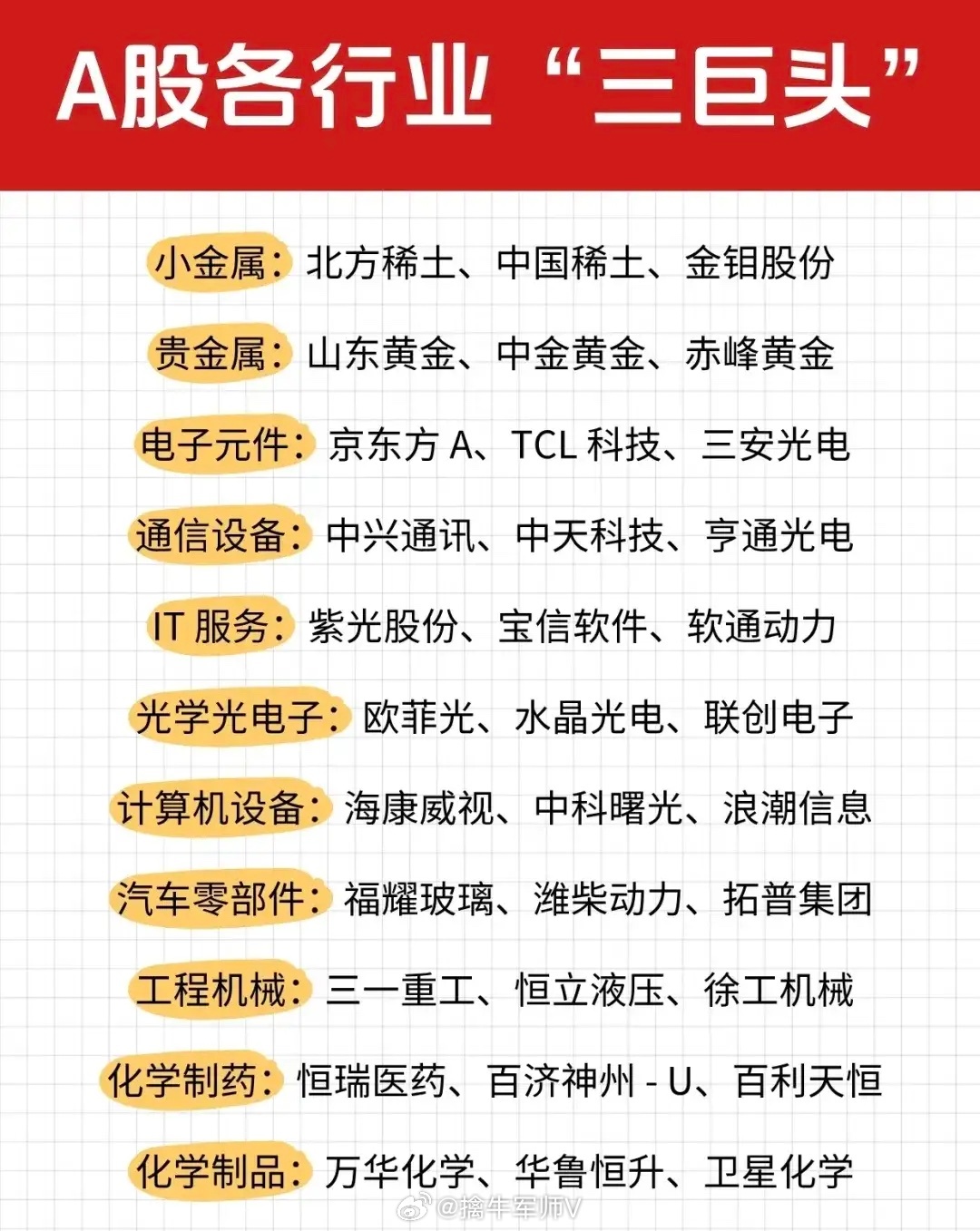 🔥A股各行业三巨头全梳理!覆盖新能源、消费、金融、制造等核心赛道精准锁定核心赛道龙头标的!科大讯飞:人工智能三大巨头之一,中文语音技术龙头,星火大模型国内领先。紫光股份:IT服务三大龙头之一,国内ICT基础设施龙头,交换机/路由器/AI服务器国内领先,覆盖网络、计算、存储、云计算、安全全栈。航发动力:军工概念核心龙头代表,国内唯一全谱系航空发动机总装龙头。中科曙光:AI算力三大龙头之一,国内算力基础设施龙头,国产算力核心供应商。……理财有风险入市需谨慎,资料取材网络仅供参考不能作为投资依据。