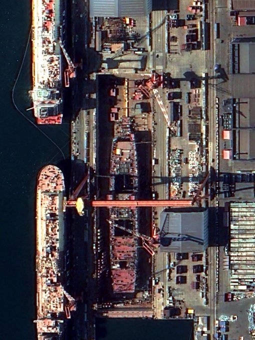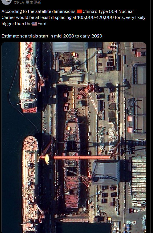 勤奋的外国网友更新了达利安船厂的新卫星照片,并大胆预测:根据卫星尺寸,004型核航母的排水量至少在105000 - 120000吨之间,很可能比福特福特号还要大,预计海试将于2028年年中至2029年初开始。