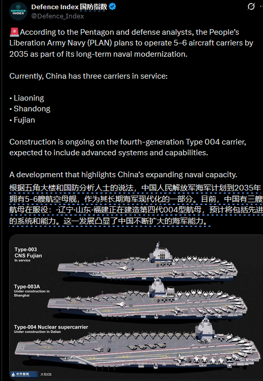 早前美国版中国军力报告其中第四章明确提到,中国可能到 2035 年拥有 9 艘航空母舰。意味着未来几年我们还得需要建造5-6航母,才跟美国报告持平。不过我们建设多少艘航母,是根据国情的合理安排,岂容他人置喙。个人觉得就算我们9艘航母也不多呀,一个省都不够一艘的😁,而且分配不均导致军迷经常吵架。