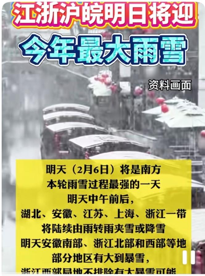 江浙沪皖此次“烂暴雪”及降温来了: 1. 天气特征:并非纯雪,而是“先雨再下雪、雨雪混杂”,雪湿重易融化,城市路面多成泥汤,仅草坪、屋顶等有少量积雪,被称为“烂暴雪”。 2. 雨雪量级:2月6日为最强时段,苏南、浙北、上海西部北部、安徽中南部可达大雪,其中苏南、浙北、安徽东南部局地有暴雪甚至大暴雪(24小时降雪量≥10毫米)。 3. 降温幅度:2月5日起寒潮南下,江浙沪皖一两天内气温从16-17℃骤降至0℃,雨雪后最低温跌破零下,山东、福建、江西等地也将降温10℃以上。 4. 主要影响:雨雪叠加降温易导致路面结冰,且恰逢周五晚高峰,对交通出行威胁大;江苏部分学校已提前放假应对。