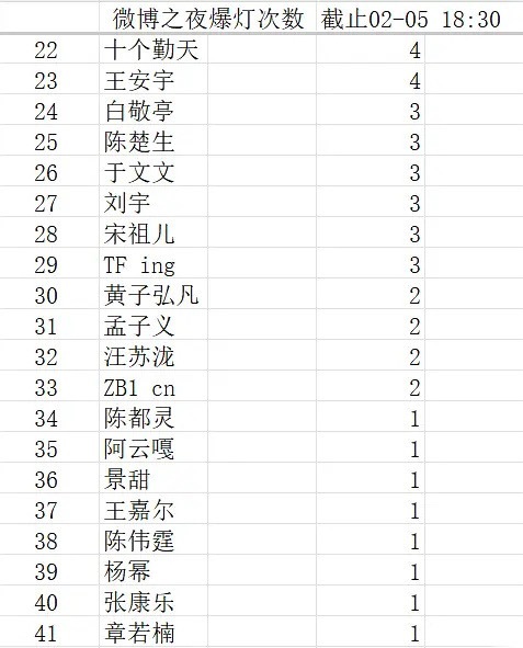 微博之夜爆灯次数拉表一览。