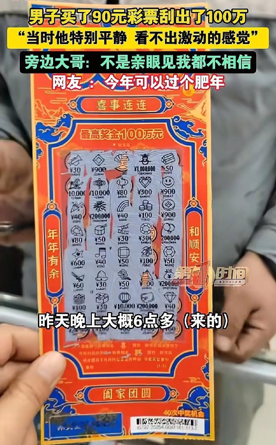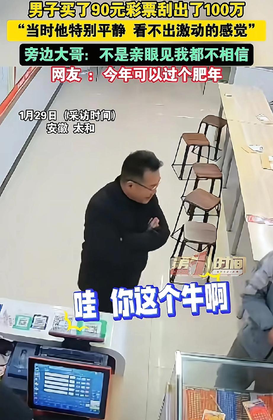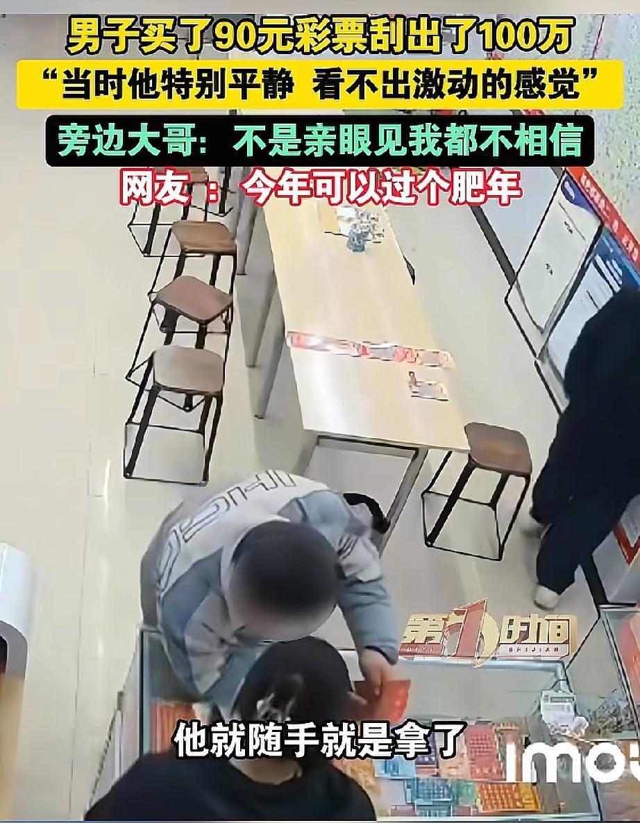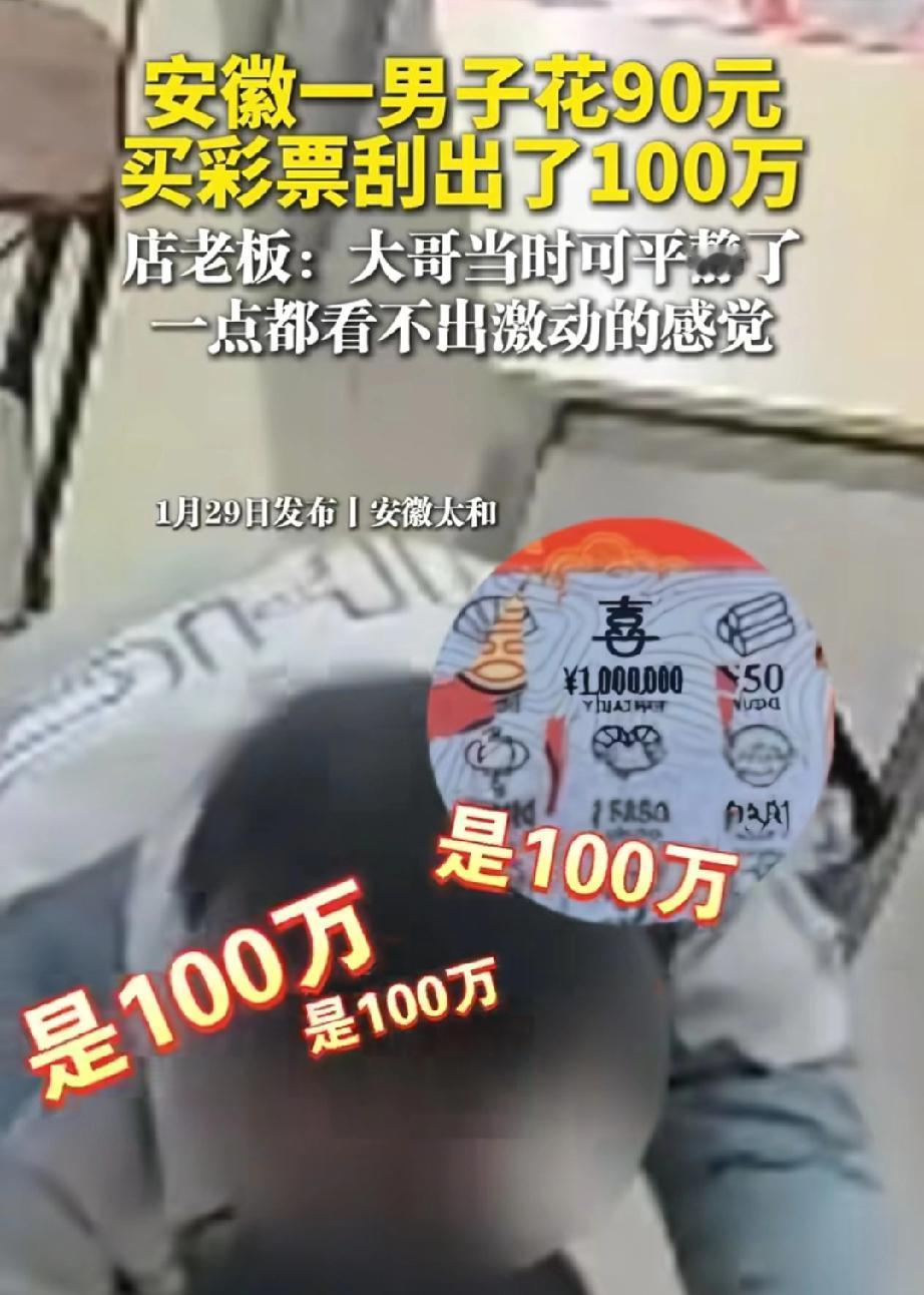 这就是命啊!安徽,一男子去彩票店刮彩票,花了90元,意外刮出100万大奖,令人意外的是男子不仅没有兴奋,反而全程淡定,好像没中奖一样,而旁边大哥表示:要不是亲眼见,我都不相信! 那天男子路过彩票店,纯属临时起意进门,既不像老彩民那样对着走势图反复琢磨,也不纠结选哪款刮刮乐,老板推荐热门款他都摆手,只说“随便拿几张”。付了90块后,他找个位置慢慢刮,前面中了小奖也没喜没忧,依旧慢悠悠。 直到老板发现他中了100万,激动地喊出声,他也只是轻“哦”一声,刮完剩下的彩票,问完兑奖流程就悄悄离开,没跟任何人炫耀,连联系方式都没留。 旁边大哥直呼“要不是亲眼见,我都不相信!”,可仔细想想,他从买彩到中奖,全程没有一丝贪求,反而收获了最大的惊喜。 我们为生计奔波,常常渴望一个“奇迹”来摆脱压力,买彩票都反复挑,研究半天还不中,大哥随手拿就中100万,原来好运就爱找不刻意的人”! 今年可以过个肥年了!” 这话说到了多少人的心坎里!年关将近,谁不盼着一点好运气,让家人过个宽裕喜庆的好年呢? 有网友开玩笑说:“要是我,估计会激动得晕过去。” 大家羡慕的不只是那100万,更是那种“天降好运”的惊喜感。他的淡定和旁人的激动,一冷一热,恰恰构成了最真实、最有趣的人间喜剧。 冷静想想,真正的“肥年”和安全感,仅仅靠一张彩票就能带来吗? 中百万大奖毕竟是极小概率事件,比这更难得的,或许是那份“意外来临时的静气”。 生活里,我们常常盼着一个“大奖”来改变一切,但真正的好运,有时就藏在平凡日子里一个个小小的、踏实的希望之中。 大哥这哪是淡定,是看透了彩票的本质,图个乐就好,不贪就不会失望”。 不贪求、不刻意,反而能接住生活的惊喜;不张扬、不炫耀,才能守住意外之喜带来的平静。 随缘不强求,得意不张扬,既不抱着执念追逐结果,也不被意外的得失冲昏头脑,在平淡的日子里,悄悄接住属于自己的小幸运。