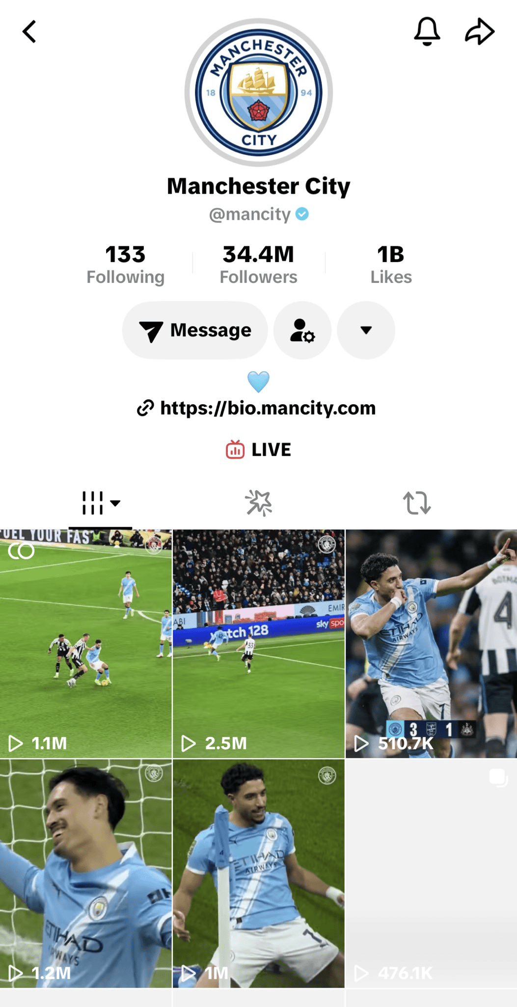 虎扑02月05日讯曼城官方TikTok账号显示其点赞数已经超10亿,成为第一家做到这点的俱乐部。