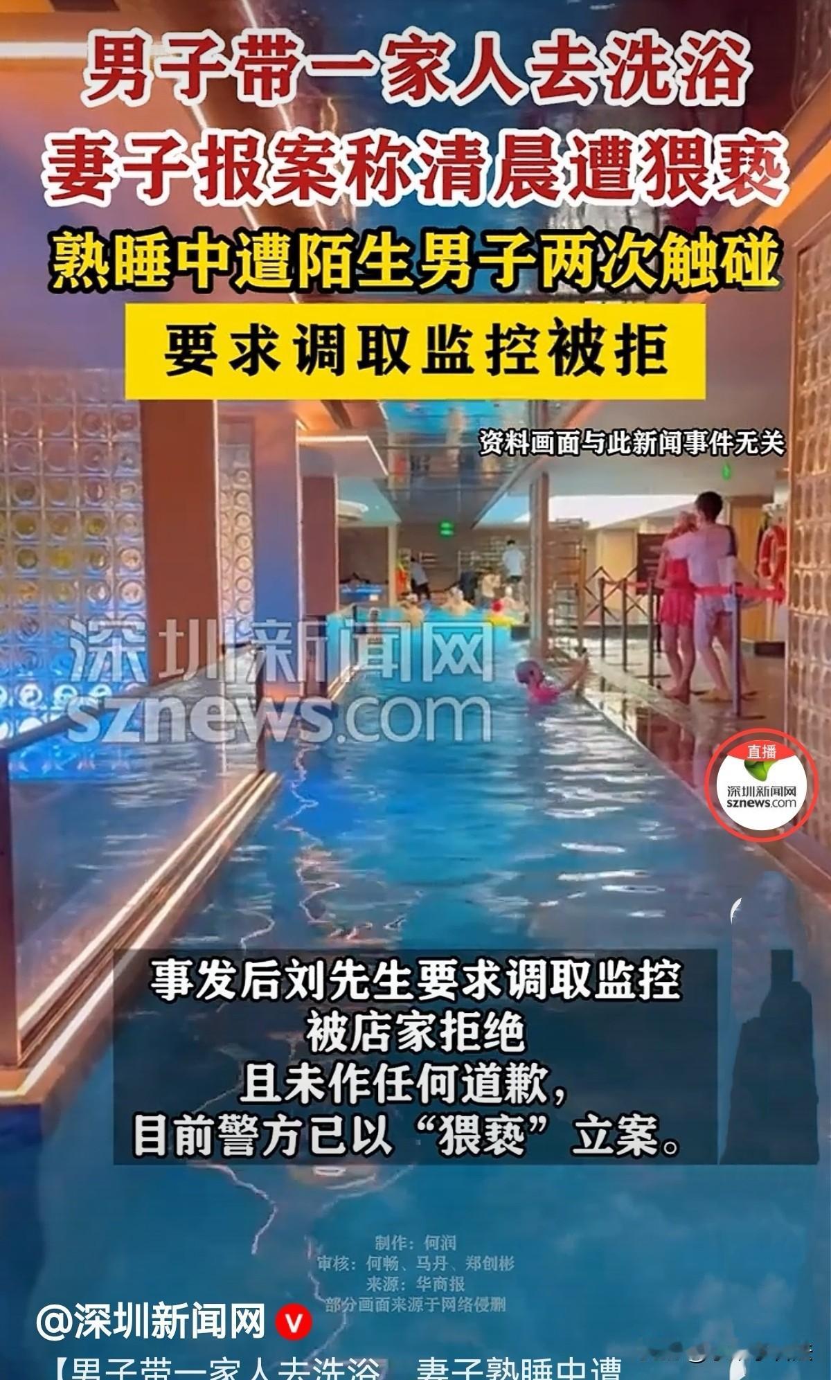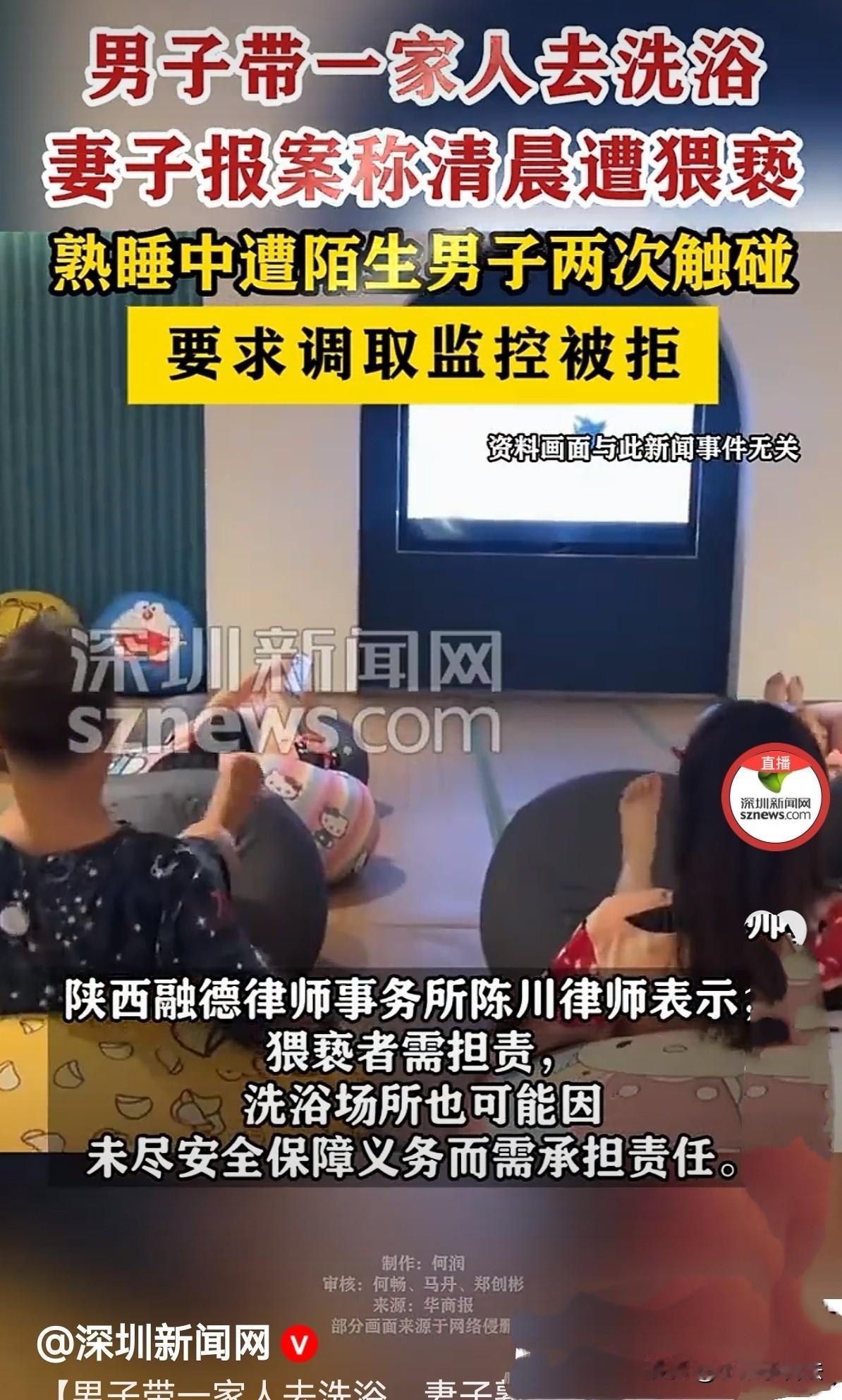 陕西西安,男子花1200元带着妻女汤泉洗浴放松,因当晚人留宿区人满,他们就去了电玩室休息,谁知,妻子在睡着后,竟被一年轻陌生男2次触碰,妻子告诉丈夫自己被猥亵了,丈夫去找店家要求调取监控,却遭到拒绝,妻子气愤报警,而后店家的表现更让他们无法接受! 刘先生觉得辛苦一年了,应该带妻女出去放松下,正好孩子放假,便花了1200元买了一家汤泉洗浴店套票:包含有洗浴、搓澡、头疗及过夜等服务,他们想好好享受下,洗个热水澡舒舒服服歇一晚。 1月31号晚上九点多,一家三口来到洗浴店,汤泉水温正合适,他泡在水里,洗去了一身疲惫,孩子在水里玩得欢,老婆也难得露出轻松笑容。 做了几项服务后,不知不觉到了凌晨一点,一家三口换好衣服垫了垫肚子,想找休息室,谁知那天的人很多,休息区域已全满人了。 刘先生让妻子孩子别着急,他去找找看,放心,绝不会让她们站一夜。 他在二楼找到电玩室找到位置,30多平米的地方搭了个30厘米高的木板台,连枕头被子都没有,就墙上挂着三台电视。 他对妻子说,上面已躺了5-6个人,没办法,只能凑合下吧! 折腾到大半夜,刘先生累得倒头就睡,老婆搂着孩子挨着他也很快入眠。 凌晨5点50分,刘先生睡醒没了睡意,想着让妻儿多睡会儿,就独自去大厅溜达。 可还没晃够一小时,老婆的电话就打来了,声音急得发颤:你快回来!赶紧的! 刘先生不知发生了什么事,赶紧往电玩室跑,一路上慌得不行,生怕出啥意外。 冲进电玩室,他看到一个20多岁的陌生男子正蹲在老婆身边,离得极近。 刘先生立刻挡在老婆身前,厉声质问:你干啥呢?凑这儿干啥? 可那男子低着头一言不发,不管怎么问都不吭声,也不起身。 没过多久孩子被吵醒哭了起来,刘先生赶紧扶着老婆、抱着孩子有去大厅一边,老婆这才带着哭腔说出实情。 原来,6点50分左右,老婆正迷迷糊糊,突然感觉有人碰她的脚,一开始以为是别人翻身不小心,下意识蹬了一下,可对方居然又碰了一下。 她瞬间惊醒,她感觉对方是故意的触碰,她感到浑身发麻,又怕又恶心,睁开眼睛一看竟是那个一20多岁的男子。 刘先生听得火冒三丈,安抚好妻儿后转身冲回电玩室,那男子居然还没走:你是不是碰我老婆了?刘先生揪住他的胳膊质问,对方才支支吾吾辩解:我……我可能用腿碰了一下,不是故意的! 这种敷衍的话彻底点燃了刘先生的怒火,他拉着男子就往前台走,要求调监控说清楚,可工作人员头都没抬就拒绝:监控不能随便看,我们没权限。 “我老婆在你们店里被人猥亵了,调监控怎么了?你们就是这么保障客人安全的?”刘先生气得满脸通红,嗓门都高了八度,可工作人员要么不搭理,要么就说“管不了”。 刘先生非常生气,让老婆报警。 民警很快赶到,在警方要求下,店家才不情不愿地调出监控,画面清晰记录下男子故意触碰的行为,民警当场将人控制。 可让刘先生寒心的是,从报警做笔录到准备离开,汤泉店没有一个工作人员出来解释,更别说道歉了。 他找到负责人理论,对方要么避而不见,要么就说“这是客人之间的事,跟我们没关系”。 越想越气的刘先生联系了记者,记者跟着他来到店里,发现“宾客须知”上明确写着凌晨2:00-6:00过夜需加收30元、登记身份证。 可刘先生买的套票没被收过夜费,也没登记身份证,店家就允许他们过夜了。 记者想了解情况,却被工作人员一口回绝:“不接受采访,有事儿去派出所问。” 这事儿传到网上后引发热议。 有人说,就碰了下脚,小题大做!也有人反驳,都被蹬开了还敢碰,明显故意的,报警太有必要了。 其实懂法的都知道,猥亵的认定不在于接触部位,而在于是否违背他人意愿、侵犯对方自主权和羞耻心。 男子被示警后仍故意触碰,主观恶意明显,警方以猥亵立案完全合理合法。 而汤泉店作为经营者,没按规定登记身份证、收取过夜费,出事後拒绝调监控、态度冷漠,明显没尽到安全保障义务,按法律规定得承担相应补充责任。 刘先生越想越憋屈:花一千多块是来放松的,不是来受委屈的!我老婆现在晚上都睡不着,一闭眼就想起当时的场景,店家连句道歉都没有,太寒心了! 目前案件还在处理中,刘先生表示会维权到底,既要让猥亵男子受惩罚,也要让汤泉店为失职负责。 服务行业也不能只想着赚钱,把消费者安全抛在脑后,安全保障做到位才能赢得信任,不然迟早砸了自己的招牌! 对此您怎么看?