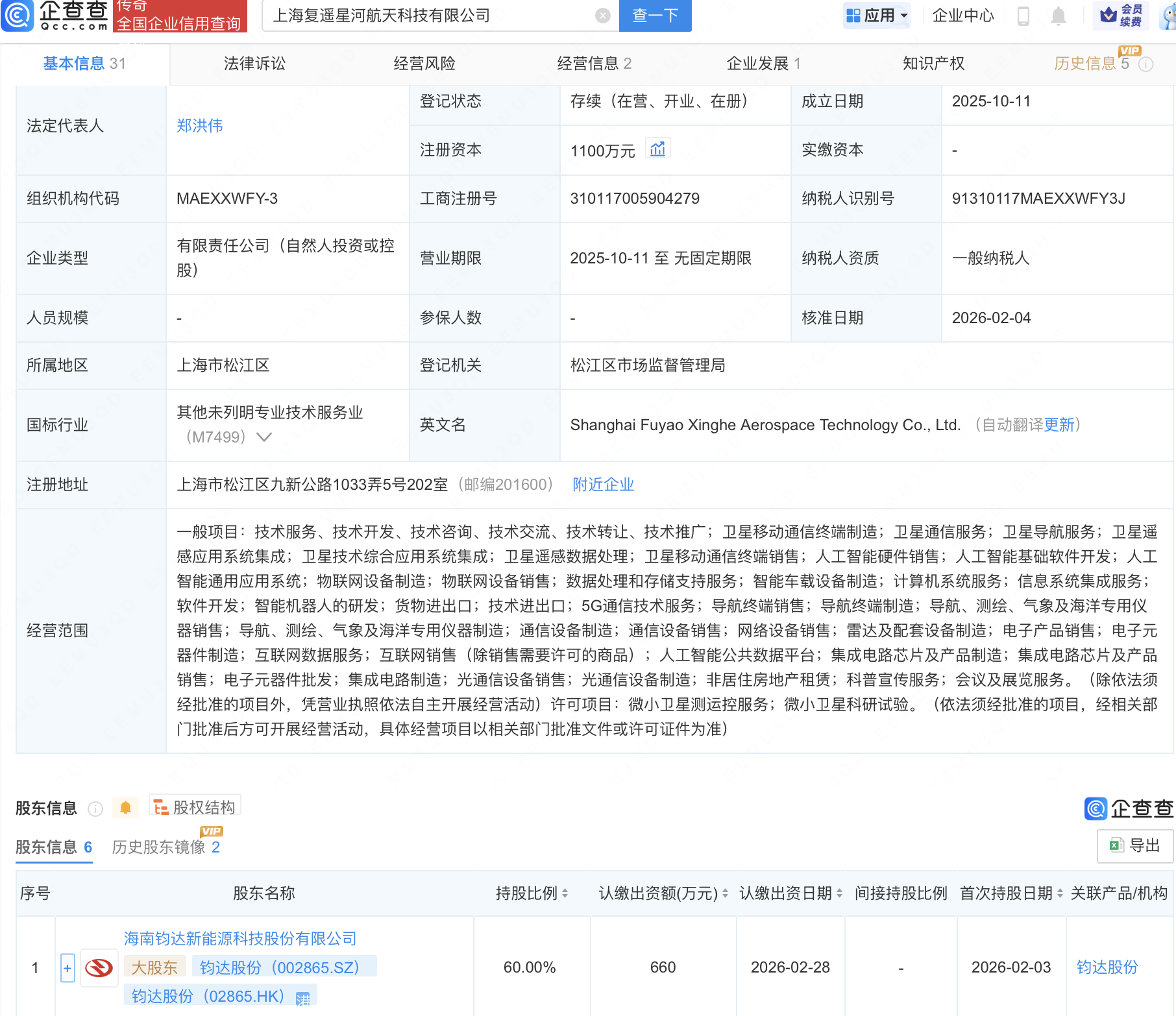 企查查APP显示,近日,上海复遥星河航天科技有限公司发生工商变更,多名股东股份下降,新增钧达股份(002865)为大股东,持股60%,同时注册资本增至1100万元。企查查信息显示,该公司成立于2025年10月,经营范围包含:卫星遥感应用系统集成;卫星技术综合应用系统集成;卫星遥感数据处理;卫星移动通信终端销售等,其全资控股上海巡天千河空间技术有限公司。