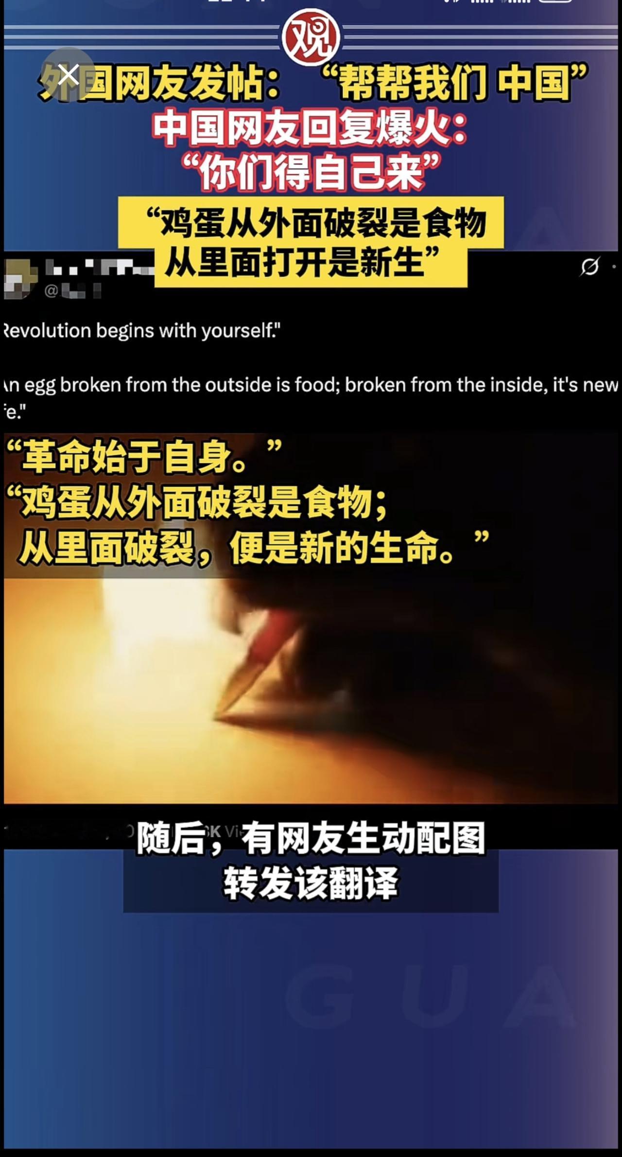 中国网友给美国网友的留言:“革命是从你自己开始的。鸡蛋从外面打开是食物。从里面打