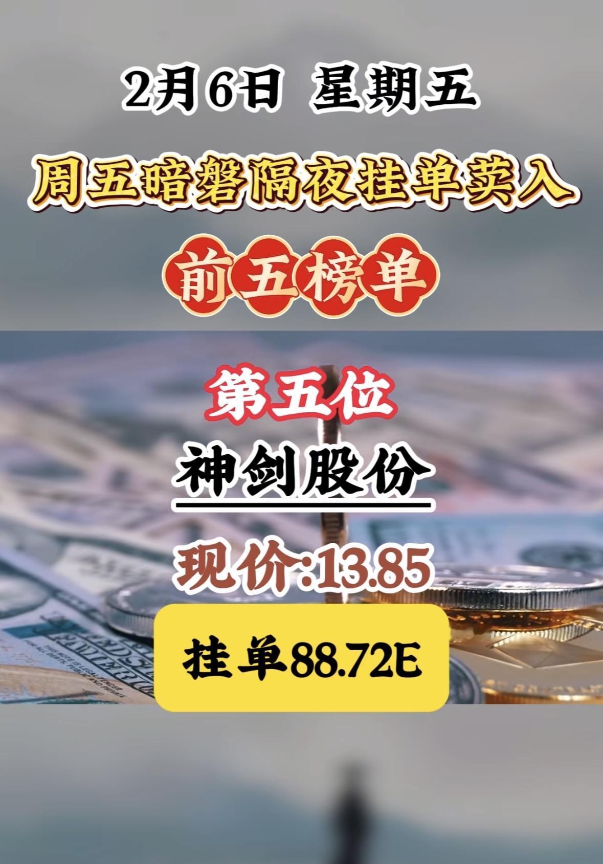 神剑股份现价13.85,挂单88.72E,周五暗盘隔夜挂单榜。 周五暗盘挂单活