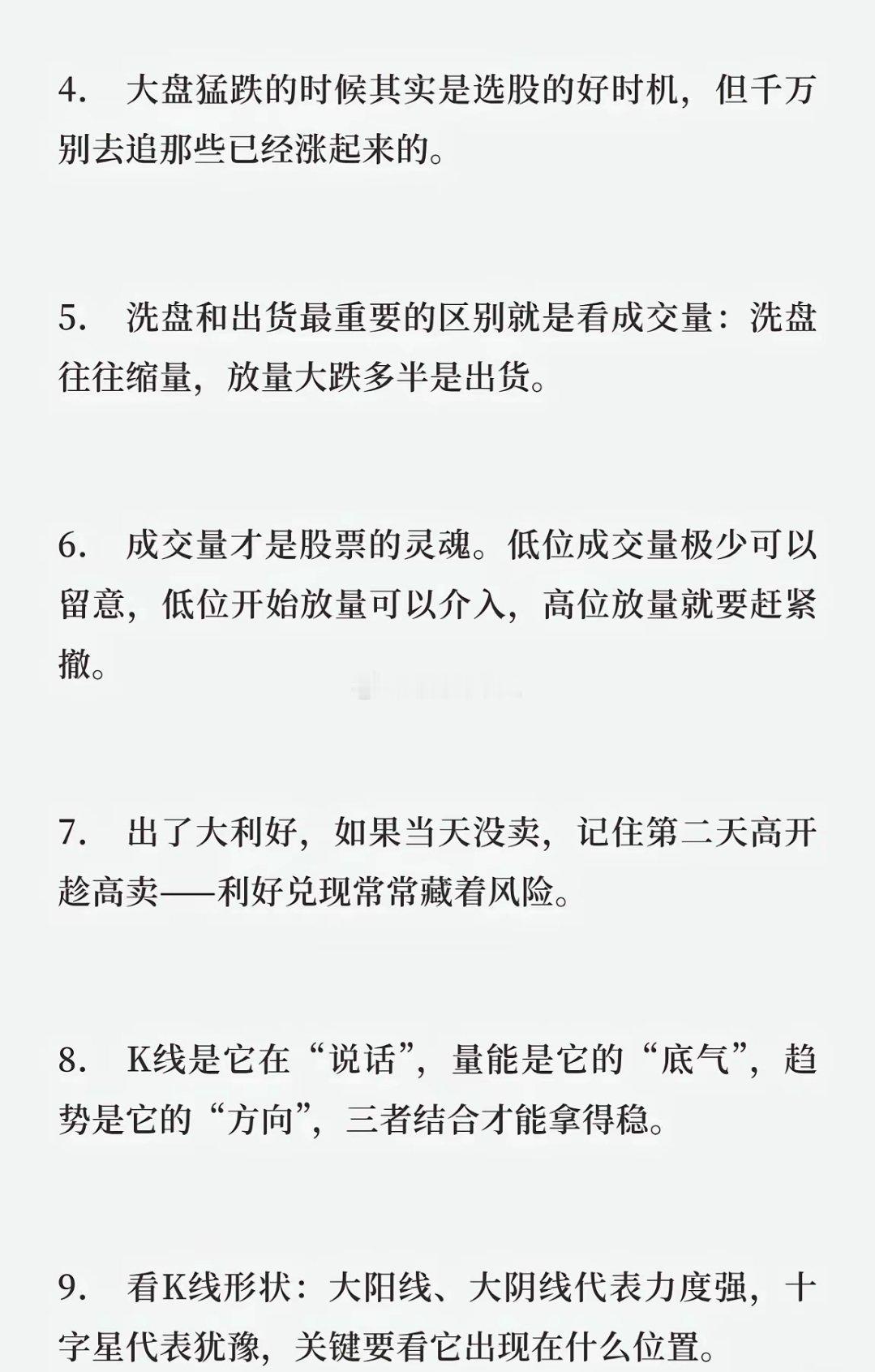 炒股经验要点节日策略:大节日前一周减仓或清仓。板块龙头:每个板块约四只带头股,它们启动板块才动。仓位控制:本金少时,一年抓一波大涨即可,不长期满仓。暴跌选股:大盘大跌是选股机会,但不追涨。洗盘出货:洗盘缩量,放量大跌多为出货。成交量核心:低位缩量留意,低位放量介入,高位放量撤离。利好处理:大利好当日未卖,次日高开应卖出。三维分析:K线(语言)、量能(底气)、趋势(方向)结合。K线形态:大阳/大阴力度强,十字星表犹豫,看位置定意义。量价关系:上涨需放量,下跌宜缩量,否则可能假动作。趋势判断:均线向上为牛市,向下为熊市,顺趋势操作。