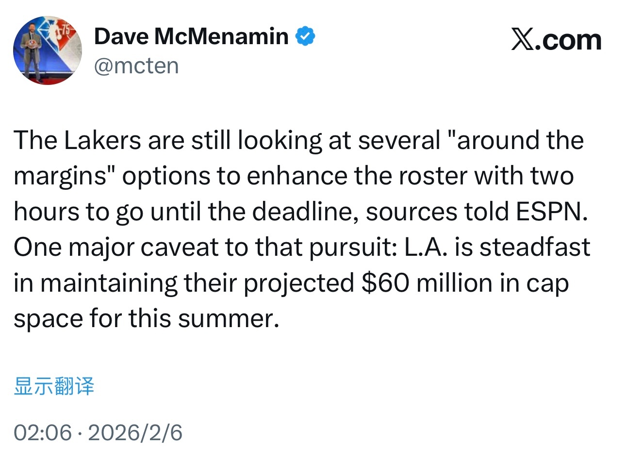 据消息人士透露,距离交易截止日期还有不到两小时,湖人仍在考虑一些“边缘”方案来补强阵容。但有一个重要的前提条件,湖人坚持今夏维持6000万美元的薪金空间。