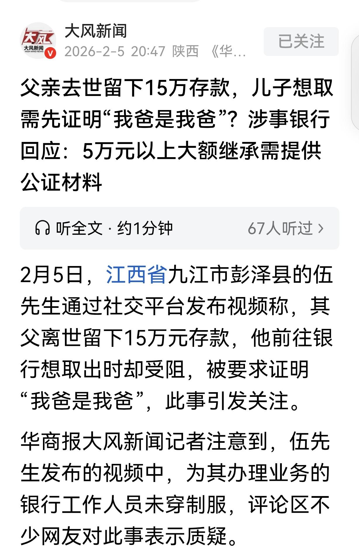 “太荒唐?”江西九江,一男子去世留下15万存款,他停在殡仪馆急等钱下葬,儿子拿着火化证、户口本,父子2人的身份证去取钱,却被要求出示继承权公证书,先证明“我爸是我爸”。银行:取款超5万元需要提供公证书,这是规定。网友质疑:办理业务的工作人员没穿统一工装,银行是否存在外包情况?银行回复亮了。 2026年2月2日,伍先生的父亲去世,他悲痛欲绝,把父亲进行了火化,骨灰还放在殡仪馆,到了让父亲入土为安的时候,伍先生却没钱安排后事了。 还好,父亲生前省吃俭用,在银行存了15万,15万是分5个存单存的。 可见,这是父亲节衣缩食积攒下来的,其中一个存单是20000元,已经到期了,把15万取出来,就能解燃眉之急,给父亲办一个风光的葬礼,他活着没享福,走后让他体面一些。 自己身为儿子,却要花父亲的遗产,才能让他安息,伍先生无比自责,可家里条件不好,他也没有别的办法。 在亲属的陪同下,伍先生拿着家里的户口本,证明他们的父子关系,还有父亲的火化证,说明他已经撒手人寰,还有父子两人的身份证,匆匆来到银行取钱,却直接被拒绝了。 工作人员告诉伍先生,取款超过5万,就要出示继承权公证,先证明“我爸是我爸!”,这是规定。 伍先生傻眼了,父亲急等钱下葬,这边取钱受阻,他很是崩溃,认为银行刁难。 伍先生一气之下发视频把这件公之于众,他认为银行要求“证明我爸是我爸”的规定太荒唐了,户口本就能证明,父亲离世,等钱安葬,何必如此不近人情? 视频发出去后,有人质疑,给伍先生办理业务的工作人员没穿制服,怀疑银行是不是存在外包情况? 事情引发关注后,银行回应,银行并不是刁难,也理解伍先生的心情,但得相互理解,如果逝者的存款低于5万,只需要凭借死亡证明、身份证明、亲属关系证明就能取出来。 但存款高于5万,就需要提供公证书,这是规定,至于银行工作人员没穿制服,是因为对方是新员工,工作服尚没发呢,不存在外包情况。 有人说,银行做法没错,这是遗产了,必须所有继承人达成一致才能取走,如果没有密码给取走了,后面还有其他继承人,说银行没有尽到遗产保护义务。 有人提议,建议老年人账户可以在银行留存一条备案,说明某人可以使用该账户里钱的,备案时某人必须和老人同时到场。也可以一个账户两个人名,一个老人本人,再加一个老人指定的可以使用账户里钱的人,初次办理时,也是必须两人同时在场。这样一旦老人生病急用钱、老人去世,另一个人可以用老人账户里的钱去处理。 知道密码的,带身份证有多少可以取多少,不知密码的,就要公证。的确有了公证书后,去银行一路绿灯,毫无任何人阻挡的就把事情办了。这是事实。 银行这规定,说没错吧,确实是为了防止遗产纠纷,毕竟除了儿子,可能还有其他继承人。 但放在伍先生这种急着用钱下葬的场景里,又显得太冰冷了。户口本、火化证都摆出来了,还要证明“我爸是我爸”,这不就是把简单事情复杂化? 真遇到这种事,普通人哪有心思耗在跑公证处上?而且公证还得花钱花时间,伍先生本来就等着钱办事,这不就是火上浇油。 银行总拿“规定”当挡箭牌,却不肯灵活处理特殊情况。就算要按流程走,能不能开通个绿色通道? 至于网友说的备案提议挺靠谱的,老人活着的时候就能指定继承人,省得死后麻烦。 其实银行完全可以多做些便民服务,比如提前给老人做遗产支取备案,或者简化小额遗产的支取流程,别让规定变成冷冰冰的壁垒。 《商业银行法》第29条规定,商业银行办理个人储蓄存款业务,应当遵循存款自愿、取款自由、存款有息、为存款人保密的原则。 但存款人去世后,大额存款属于遗产范畴,需经继承权公证确认继承人,这是为了保护所有继承人的合法权益。 银行的操作符合法律规定,但在人性化服务上有改进空间,可在合规前提下简化特殊场景的办理流程。 对此,你怎么看?