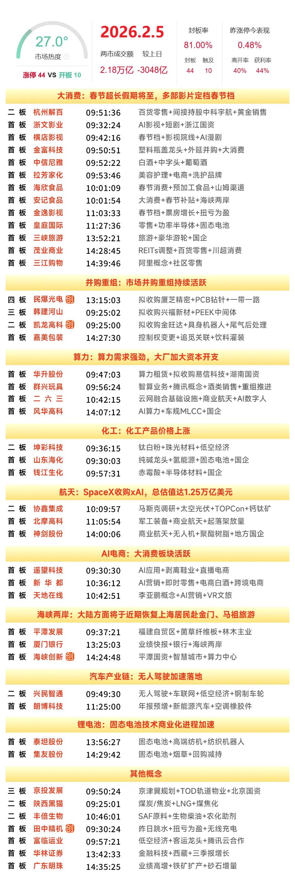 2月6日盘前预案:市场短线持续轮动,短线思路或许要有所转变! 1、昨天的市场再次出现明显调整,比调整更扎心的是量能持续萎缩,市场整体成交额已经不足2.2万亿,创了今年来的新低,外围美股也持续下杀,黄金白银期货暴跌,整体就是明显的腥风血雨,而A股短线接力情绪持续暴击,短线轮动越来越快,很少有板块能够坚持两天,一旦调整,都是板块整体大幅调整,这样的行情下,短线操作难度是地狱级的,从情绪上看,短线思路真的要开始有所转变了! 2、风光无限的太空光伏被光伏协会一个声明直接打趴下,多只强势股开盘出现极大负反馈,板块整体大跌超5个点,这样的杀跌仅次于之前持续高潮的贵金属方向,但是那个方向是持续暴涨后的杀跌,而光伏整体才刚起步,消息面的刺激上涨竟然毫无溢价,确实挺伤人的! 协鑫虽然顶着板块弱势强势封板,盘后再次声明未获得太空光伏订单,整体情绪降温非常明显,所以协鑫开盘的表现对于整个太空光伏的修复非常重要,如果它能情绪高开,对于昨天大跌的光伏方向肯定会有带动性,而双良开盘能否走出修复是另外一大看点,毕竟是近期的龙头,走出如此形态非常难看,总得来说,协鑫开盘想要去低吸的话,整个光伏的情绪回暖非常关键,至少板块整体不能出现持续大跌表现,至于弱转强的上板接力,现阶段的市场好像并不可取! 3、商业航天巨力低开后出现资金承接抢筹做多,但是资金畏高情绪非常强烈,好在它拉升高位整体是一个横盘形态,承接还非常不错,虽然高位滞涨很像出货,但是从情绪上看,它能走出趋势性,对于整个商业航天方向还是颇具看点的,它和AI的浙文类似,二波加速受阻后,接下来或许会是高位盘整的走势,只要不出现大幅下杀负反馈,巨力整体还是比较适合去做低吸的,但是追涨必须结合板块情绪一起看! 神剑午后的反包是带动了巨力拉升的,这是一只超跌的前期龙头个股,在这个位置走出反包板就是趋势逆转的信号,所以接下来是短线可以重点关注的一只个股,如果能够走出趋势上行,那么整个商业航天至少整体还有局部板块效应,毕竟商业航天和AI是近期一直贯穿的题材,老妖股的轮动表现对于板块整体的帮助还是有的,但是从短线的思路上,也要更尊重市场的选择,这些情绪反复活跃的个股是比较适合做趋势波段的,近期的巨力、西部、中超都是如此! 4、海峡方向因为消息面出现强势反弹,平潭和海峡两只前期老妖股走出涨停,特别是平潭,它的表现是能带动市场接力情绪的,但是整个板块确实不够强势,所以平潭更像是底部的反抽,隔日接力的欲望可能会比较低,这只个股早盘不能快速上板的话就要注意资金兑现砸盘的风险,毕竟从情理上看,海峡题材很难有持续性,平潭在这个底部位置也仅仅会是资金的一个套利行为而已! 5、离春节不到10天了,大消费开始复苏,去年持续炒作的零售开始有走强趋势,既然概念上面不让持续炒作,大消费反而逐渐抬头,所以接下来的市场短线风格真的很难把握,零售方向的接力或许是短线比较好的思路,毕竟现在4板是尽头,相对低位的零售或许会是资金尝试做短线抱团的一个新方向! 解百的两连板很漂亮,隔日竞价能不能有更强预期是一大看点,如果开盘整个零售方向集体走强,解百至少会是一个高开秒板的走势,它也成了短线资金接力最好的标的,毕竟整体位置相对较低,如果板块有持续性,资金选择抱团炒作它会是最好的选择! 茂业尾盘上板,走出了5天3板的表现,从情绪上看,它才是这一轮零售方向的情绪先锋,所以它竞价出现明显弱转强会直接助攻解百晋级,总得来说,一旦解百开盘强势无买点,它会成为资金的第二选择! 相比于茂业,三江明显就是跟屁虫了,从趋势上看,最近的趋势表现跟茂业极其相似,昨天也是茂业上板后走出跟随上板,所以它是一个合格的小弟,如果大哥强,对于它的带动肯定明显,所以对于三江来说,开盘表现强势对于整个零售方向会有助攻,同样一旦板块弱势,它可能也是最先被兑现的那一个! 6、AI应用走出来的几只个股也是跟大消费有关,都是电商方向的个股,遥望开盘秒板非常强势,但是它是明显缩量涨停,竞价不开一字的话短线资金很容易兑现,所以它开盘的表现会是这个方向的风向标! 天地在缩量跌停后走出强势反包,这样的表现非常惊艳,但是它整体还是处于高位横盘区,能不能竞价高开过之前高点是一大看点,如果竞价就能够直接突破,那么说明主力资金做多意愿比较强,吸引资金进场接力的欲望就大,而且从昨天的涨停形态上看,它是有高开预期的,如果资金真的想要强势做多,直接开在之前高点上会是大概率,反之,就说明资金做多意愿不足,一旦冲高,反而抛压会非常大! 总得来说,现阶段的市场对于短线确实是噩梦,特别是喜欢做连板接力的,龙头动不动都有A杀表现的市场是很难做的,所以很多朋友劝小胖改做趋势,只是我的模式已经成型,这两个月不是转债大亏,其实整体收益还是不错的! 本文只限于分享和交流,不构成投资建议,股市有风险,投资需谨慎!