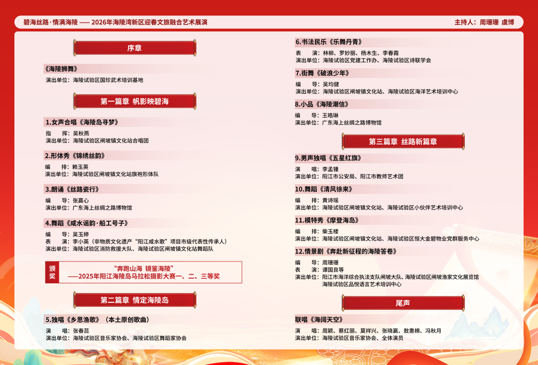 醒狮、渔歌、街舞、民乐……2月7日晚上7时30分,“碧海丝路·情满海陵”—2026年海陵湾新区迎春文旅融合艺术展演,将海陵试验区大角湾文化广场举行。据悉,本次展演通过“三大篇章+12个精品节目+重磅颁奖”串联起海陵岛的历史底蕴、人文温度与未来展望,为市民游客呈现一场沉浸式的滨海文化之旅。